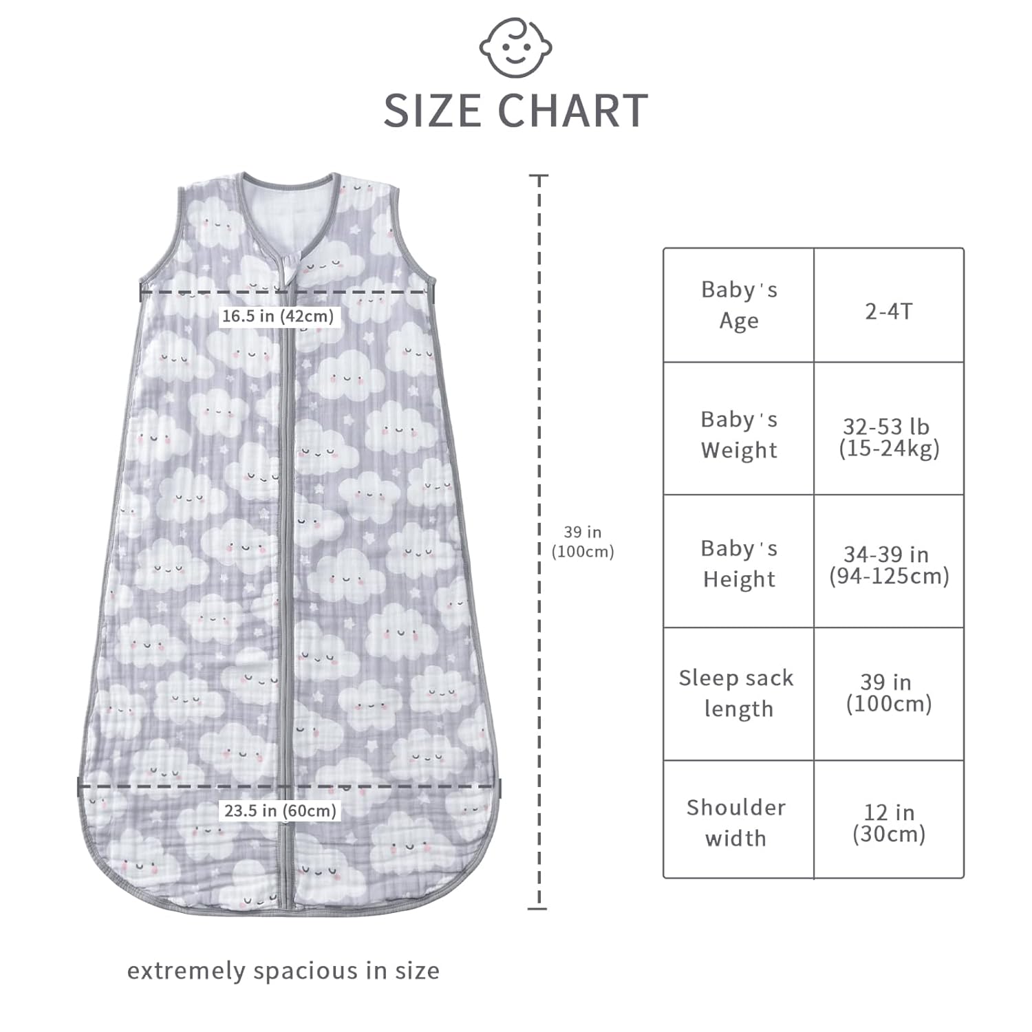 Baby Sleep Sack 2-4 T Baby Wearable Blanket 100% Organic Cotton 0.5 TOG Toddler Sleep Sacks 2- Way Zipper Soft 4 Layers 2T 3T 4T Cloud