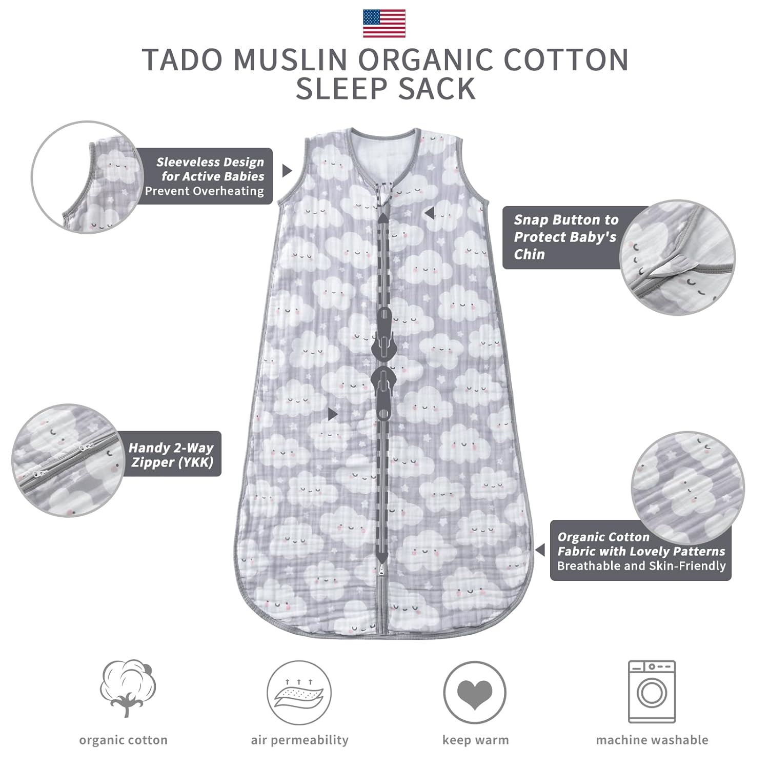 - TADO MUSLIN: At TADO MUSLIN, we are dedicated to delivering only the highest quality products. That's why our organic cotton sleeping sacks are GOTS-certified, meaning that no harmful substances have been used in the production process. Every bag is thoroughly inspected to ensure quality and safety.