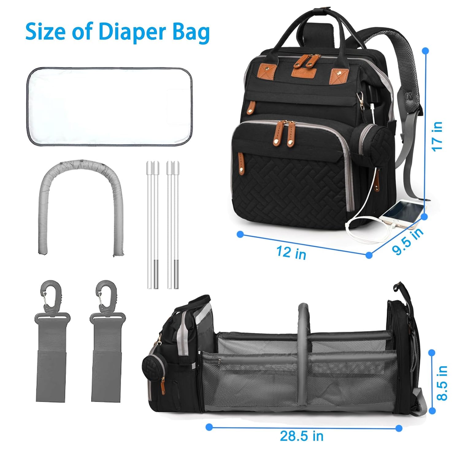 - 【Diaper Bag with Foldable Changing Station】This diaper bag comes with a diaper backpack, a detachable changing station, a washable changing pad, a pacifier case, a shading cloth, USB charging port and built-in stroller straps. All-in-one design design makes the mom's travel more easier and relaxed.