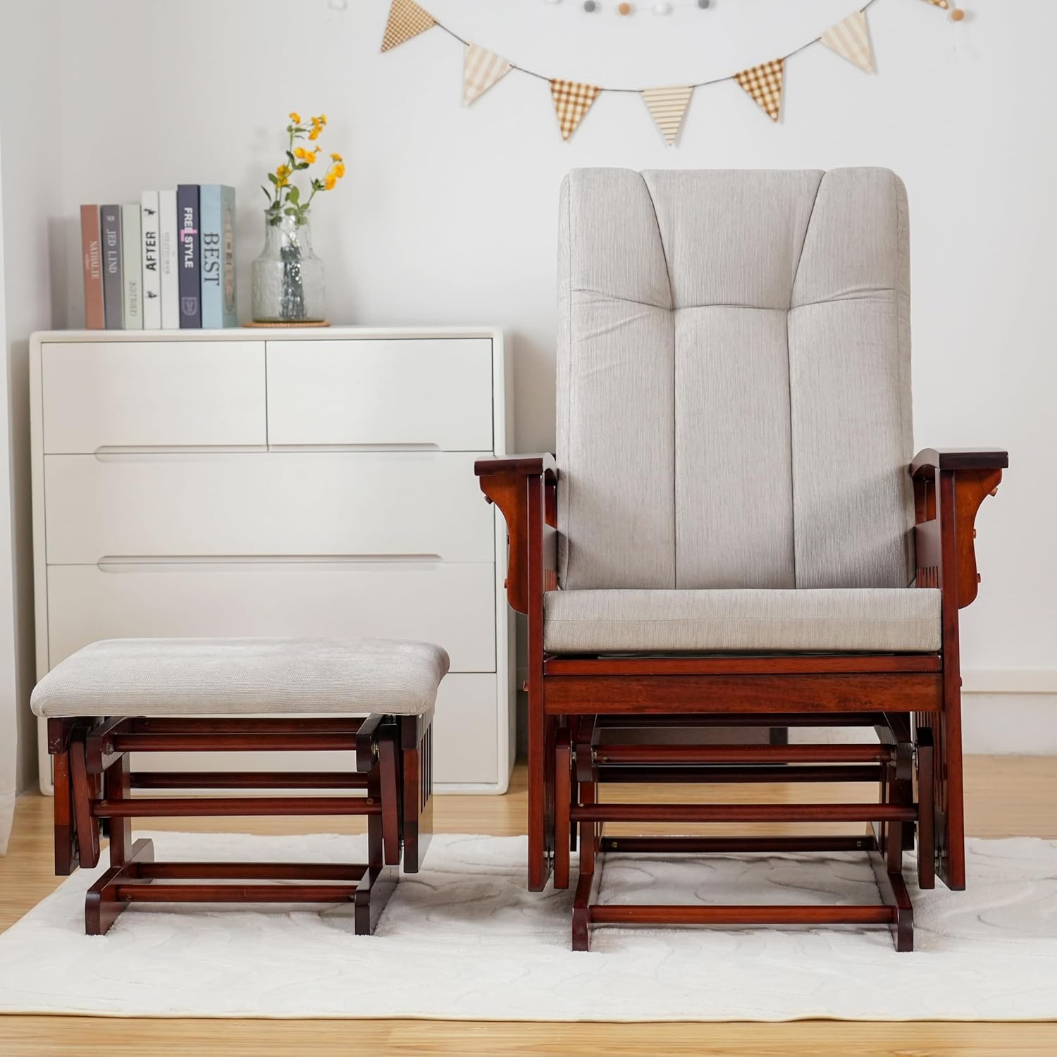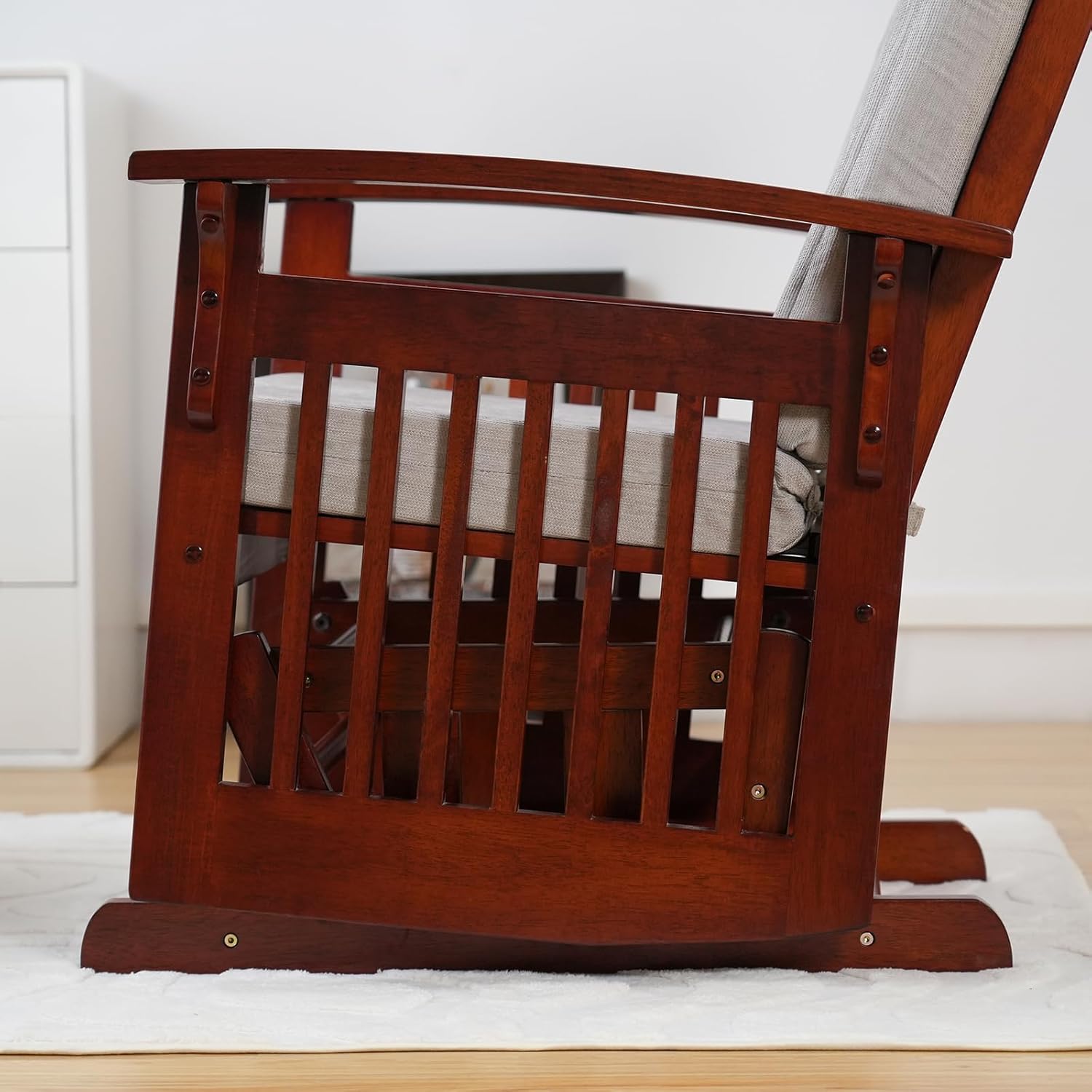 - Durable and Comfortable:Crafted from high-quality, wear-resistant rubberwood, this glider rocking chair features an ergonomically designed back cushion and armrests to ensure both durability and comfort.