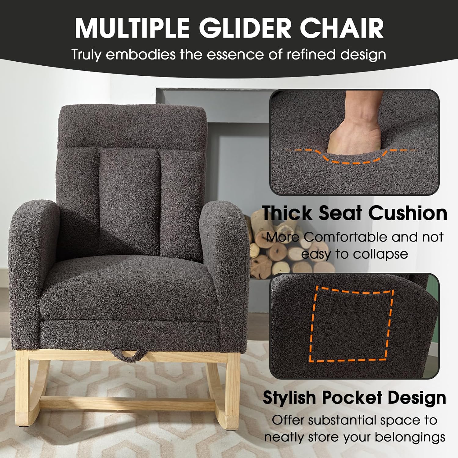 NIOIIKIT Modern Nursery Rocking Chair, Teddy Upholstered Rocking Chair with Footrest, Comfortable Rocker Recliner with Side Pocket, Glider Rocker for Living Room, Bedroom, Nursing Room (Dark Grey)