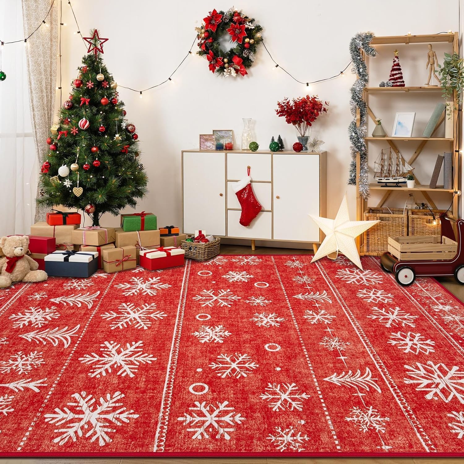 Christmas Area Rug 6x9 Red, Snowflake Washable Rugs for Bedroom Non Slip Kitchen Rug, Soft Christmas Tree Indoor Carpet for Kids Room Dining Room Entryway (6'x9', Xmas Red)
