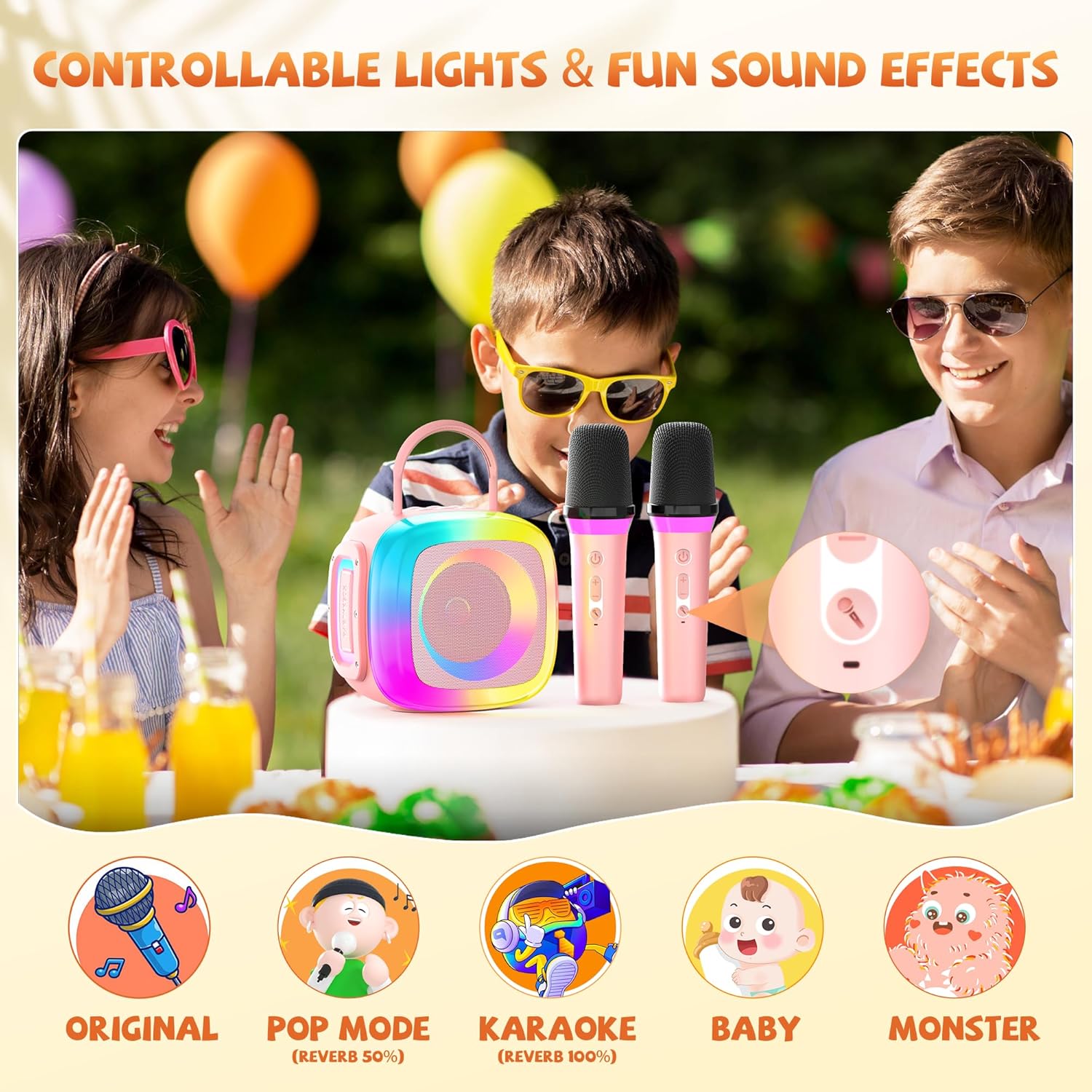 - Funny Voice Effects: Karaoke machine with voice changer features POP mode (50% reverb) and KARAOKE mode (100% reverb) to enhance the atmosphere at home gatherings. Have more fun with voice effects like Baby Voice and Monster Voice for added excitement. Portable karaoke speaker with microphone is perfect for enhancing family gathering
