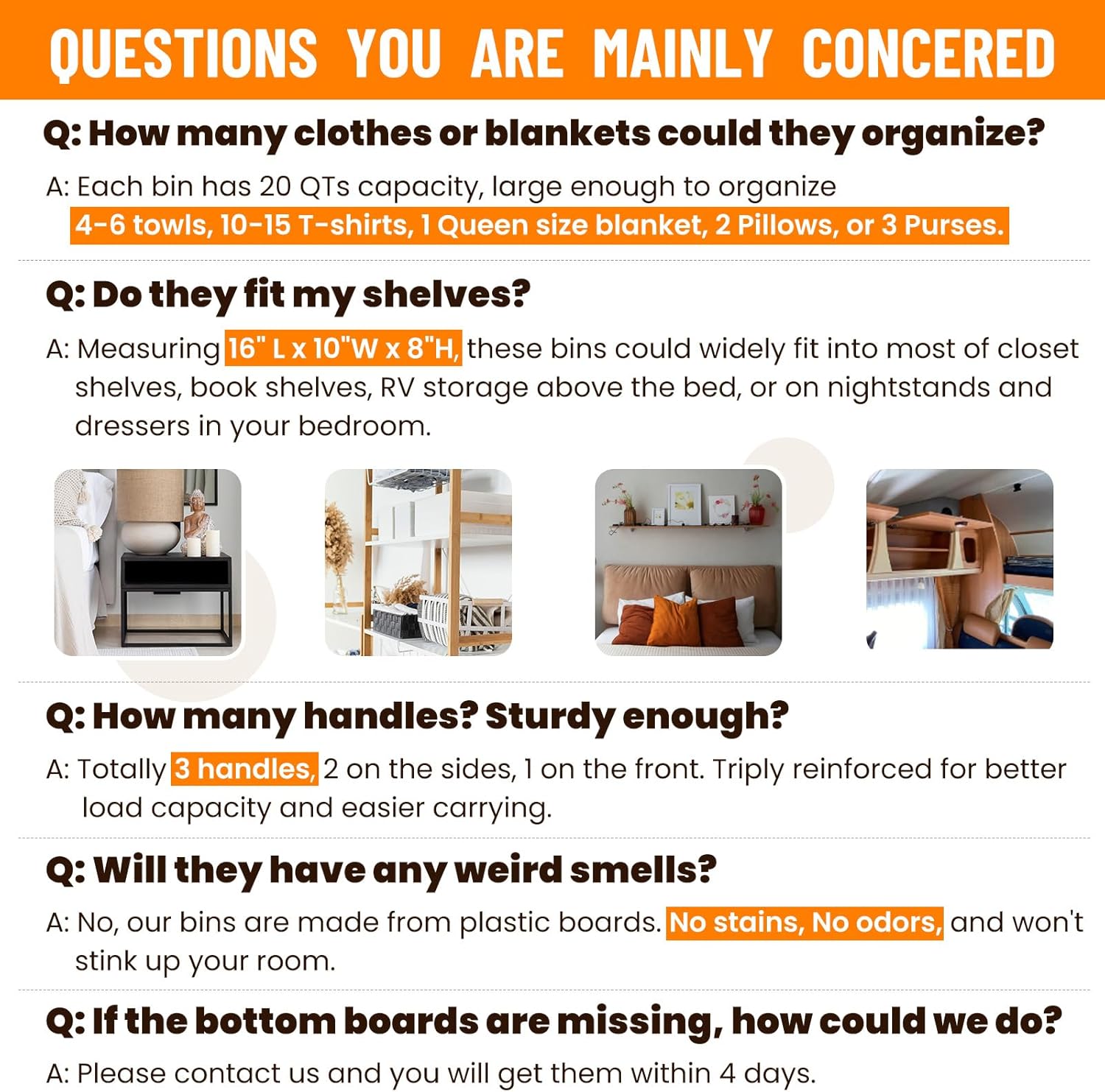 - ใ๐๐ผ๐๐๐ ๐พ๐ผ๐๐ผ๐พ๐๐๐ใOur closet storage bins are home essentials to declutter your closet, wardrobe and cabinet. Large enough baskets for organizing 4-6 towels, 10-15 T-shirts, 1 queen size blanket, 1 king size bed sheet set, 2 pillows, 3 purses, 6-10 hats, full pack yarns or some magazines.