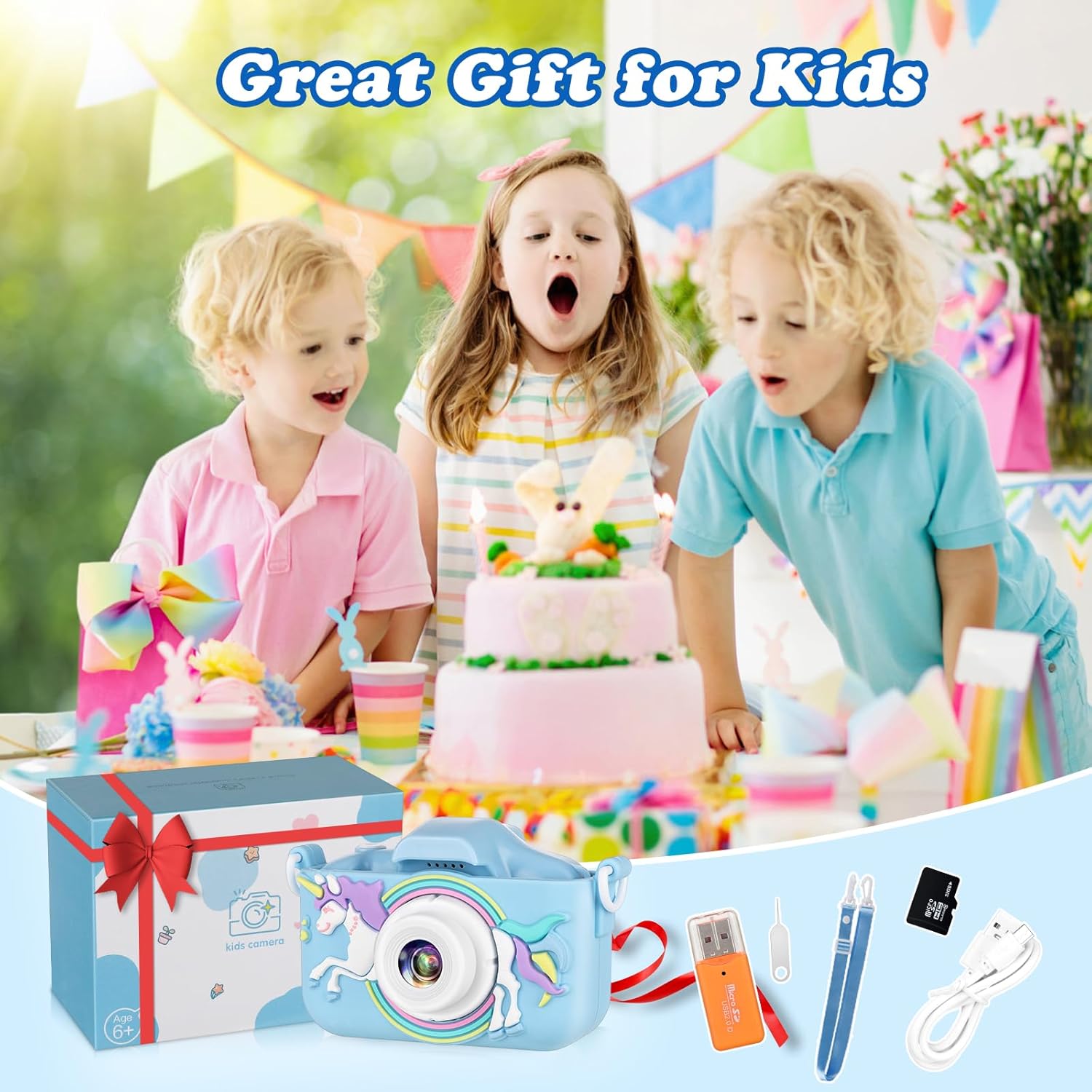 Kids Camera,HD Digital Video Camera with Protective Cover,Childrens Toys for 3 4 5 6 7 8 9 Year Old Boys/Girls,Selfie Camera for Kids,Christmas Birthday Gifts with 32GB SD Card (Unicorn Blue)