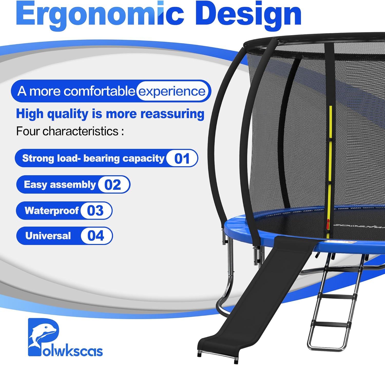 - 【Slide Cushioning Design】In order to further improve the safety and use of experience, our trampoline set added Polwkscas 24 new upgraded slide, we designed an extra section of cushioning for the slide, to avoid children sliding down due to the inertia of the forward leaning collision falls.