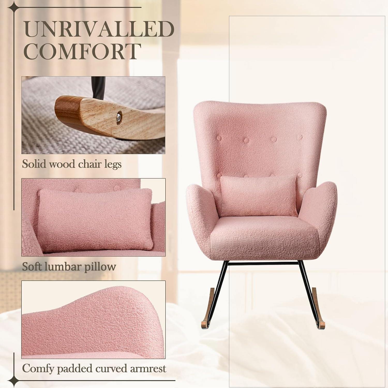 Waleaf Rocking Chair Nursery, Teddy Upholstered Rocking Chair Indoor with High Backrest Glider Accent Chair, Padded Seat Nursing Comfy Chairs for Bedroom (Pink)