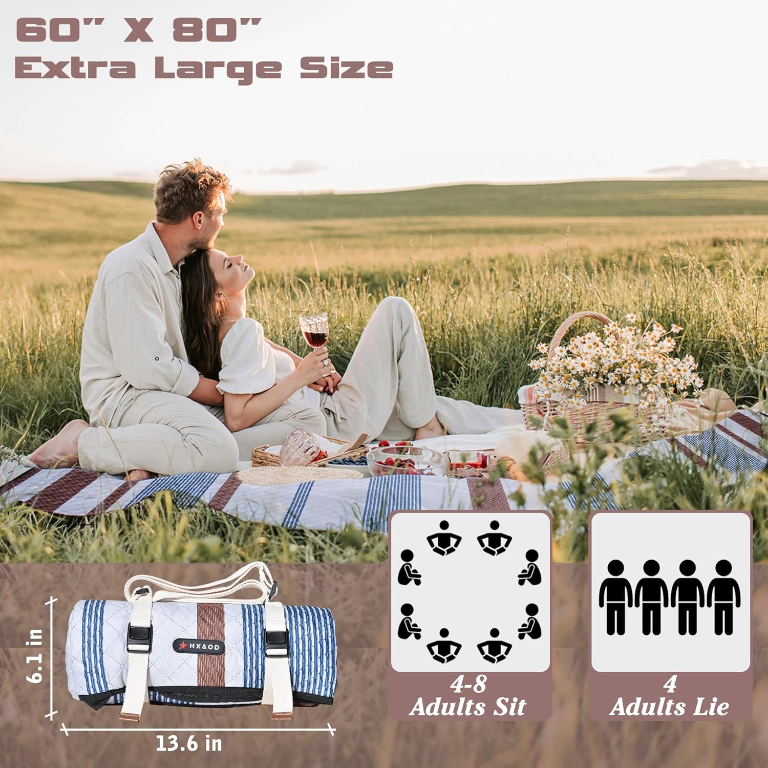 Waterproof Picnic Mat, Outdoor Camping Oversized Field Blanket. Portable Thickened Camping Blanket, Suitable for Beach, Camping, Music Festival, Party, Outdoor Adventure. (Brown&Blue&White, 80”x60”)