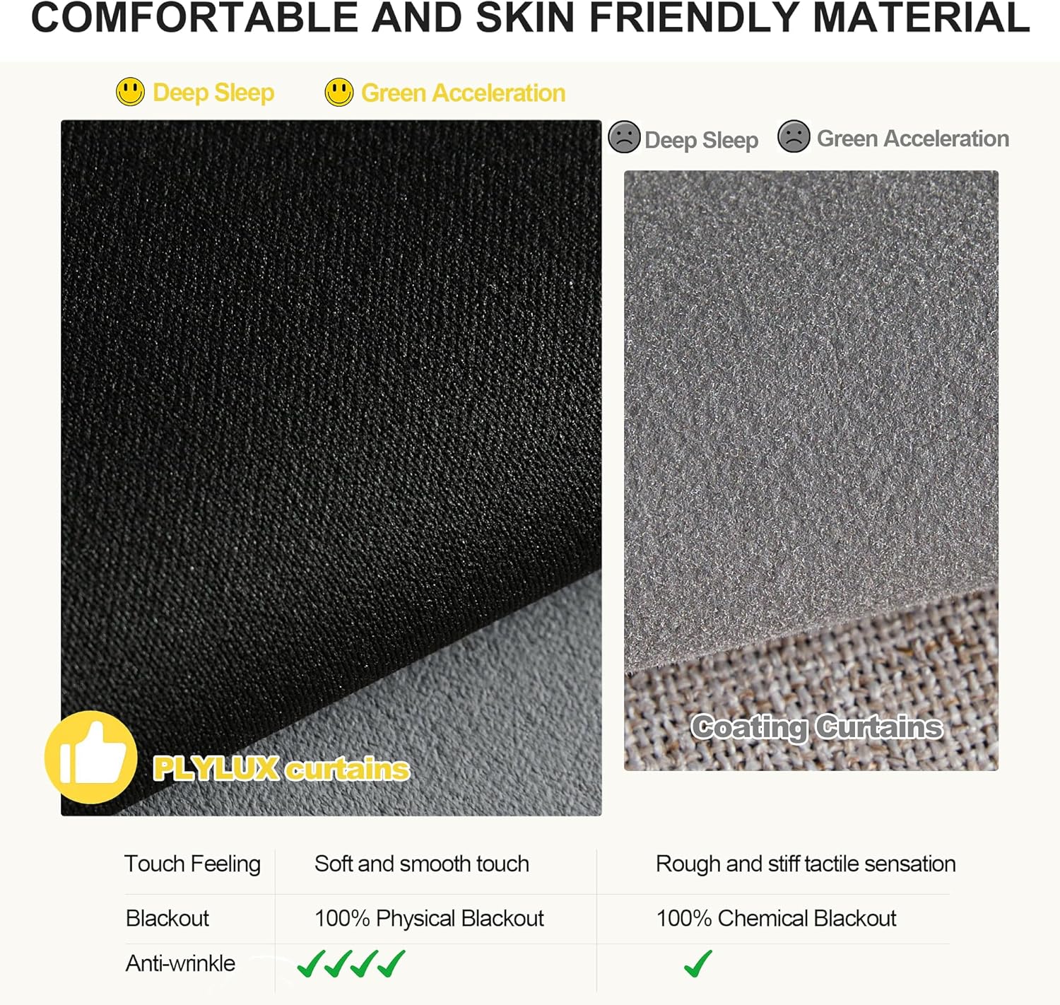 - 100% BLACKOUT: These curtains are manufactured in a STANDARD 100 certified by the OEKO TEX factory. The curtains feature triple weaving with black yarn, an extra light-blocking layer, and high-density weaving, which can 100% physical blackout bright sunlight and UV ray, bring you a full room darkening environment for good night sleep, afternoon nap and weekend lie-ins.