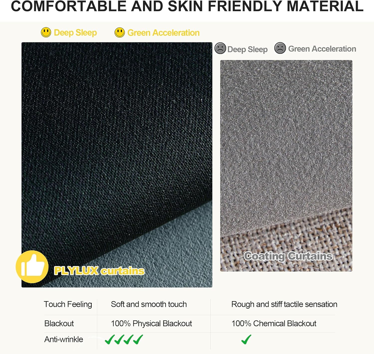 - 100% BLACKOUT: These curtains are manufactured in a STANDARD 100 certified by the OEKO TEX factory. The curtains feature triple weaving with black yarn, an extra light-blocking layer, and high-density weaving, which can 100% physical blackout bright sunlight and UV ray, bring you a full room darkening environment for good night sleep, afternoon nap and weekend lie-ins.