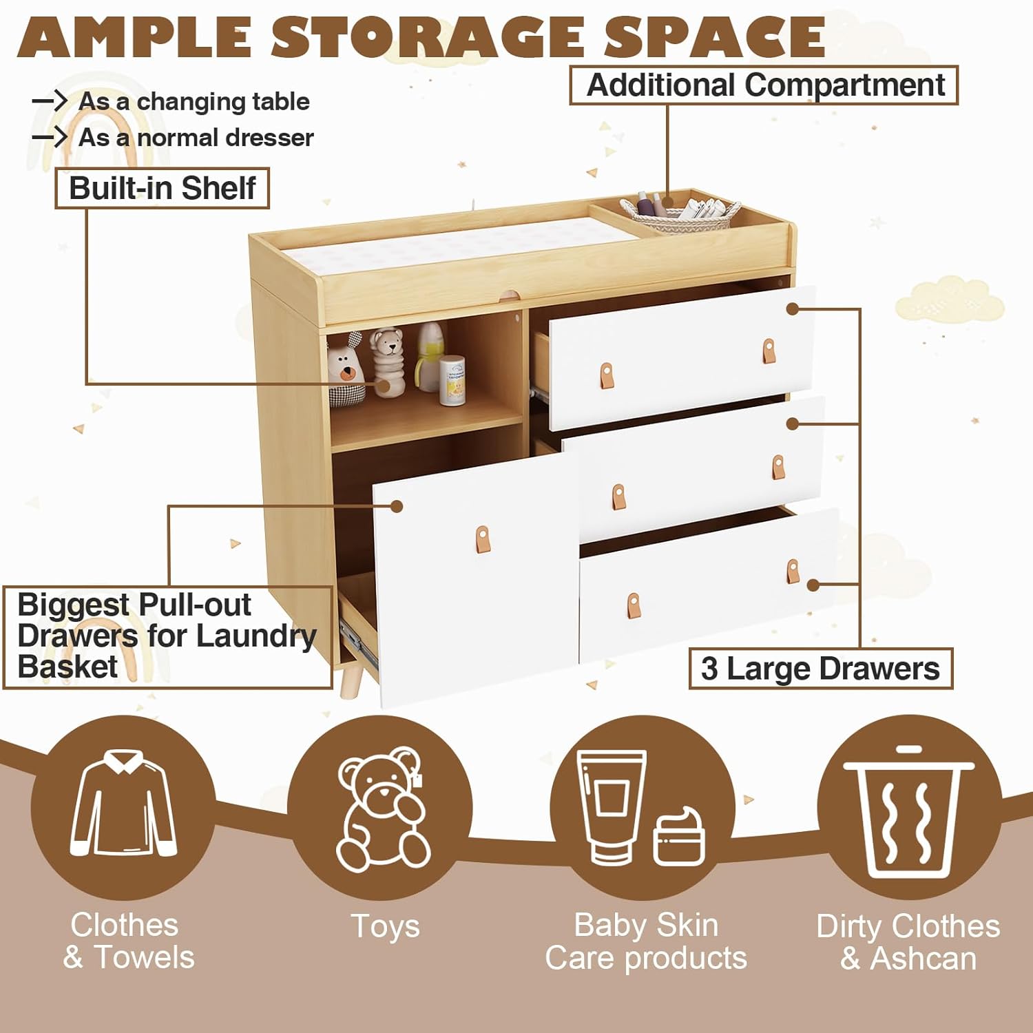 Baby Dresser Changing Table with Drawers,Shelf,Hidden Laundry Basket Storage,2 in 1 Nursery Dresser Chest for Infants, Baby Diaper Changing Station for Daycare,Bedroom,Natural
