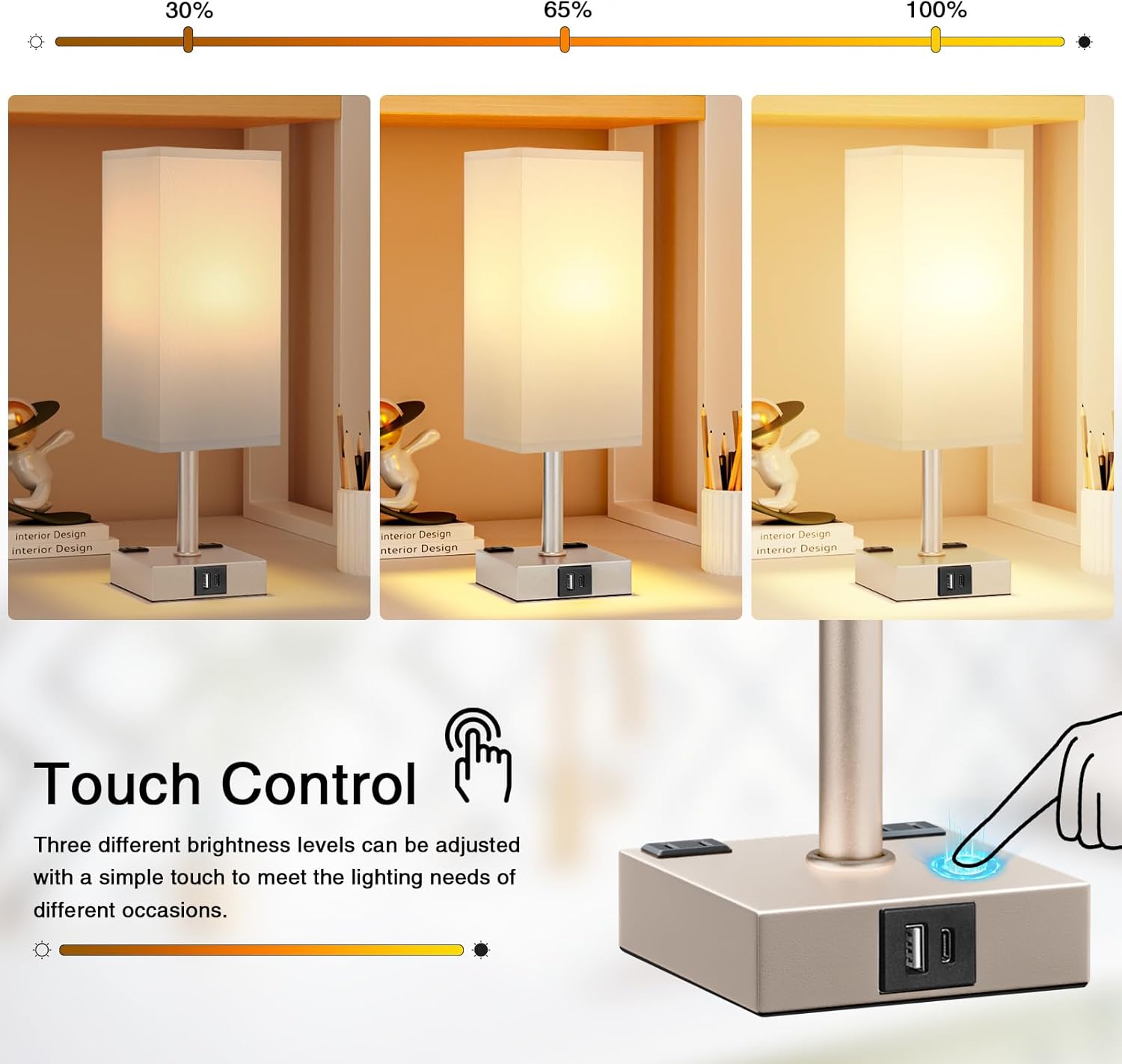 - 3-Way Dimming Touch Lamp for Bedroom - The bedside table lamp has a built-in sensitive touch sensor that allows you to smoothly switch between three different brightness levels with a simple touch on the metal base. Low brightness soft lighting creates a cozy and quiet atmosphere. Medium brightness is moderate and helps to concentrate on study and work. High brightness lighting ensures clarity for fine visual tasks