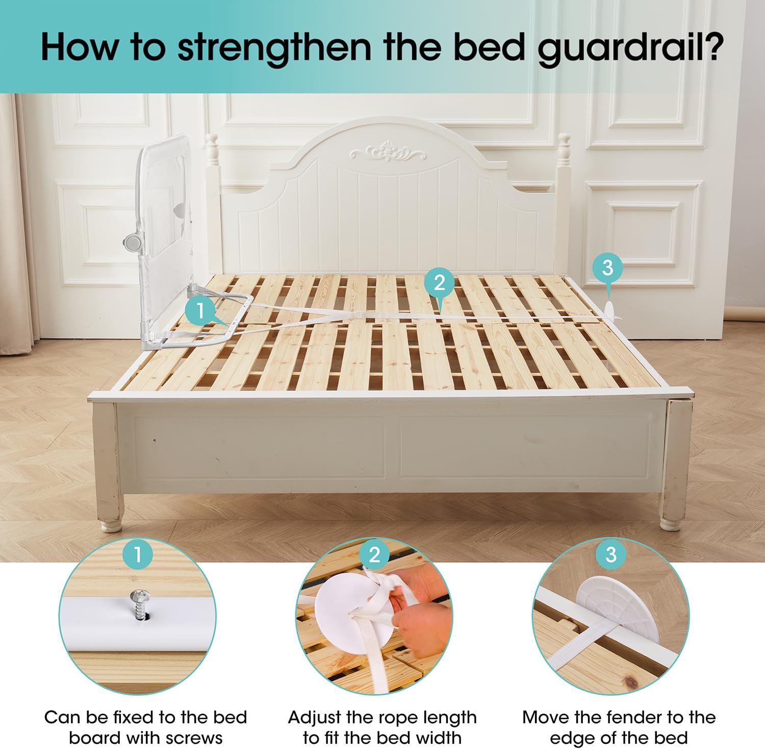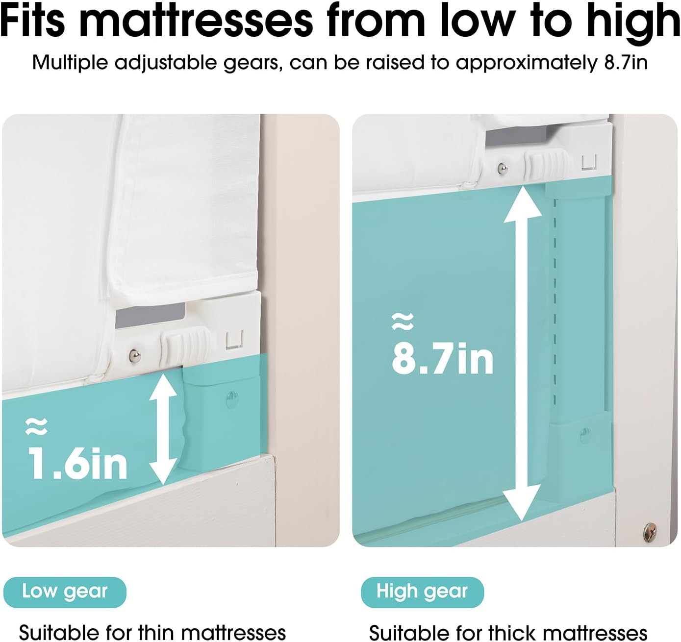 - Adjustable Heights Bed Gate:The 46” length almost covers the twin-to-queen size length of the bed and the adjustbable height is plenty to accommodate most any mattress thickness.OVERALL SIZE:46“(L)X26~34.7"(H)X12"(W). The bed rail is USPTO Patent Approved