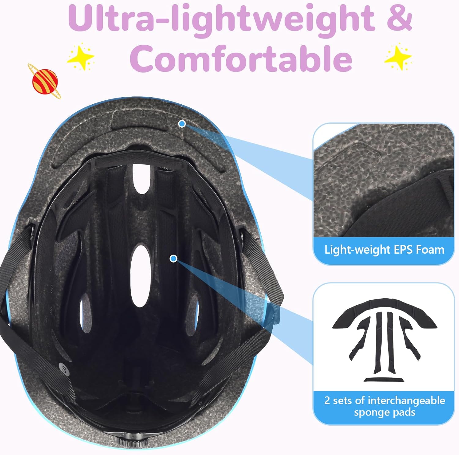 - Ultra-lightweight and Comfortable: The helmet is made of lightweight material; Package includes 1 extra set of inner pads for washing and using interchangeably; 13 vents keep kids cool even in hot weather