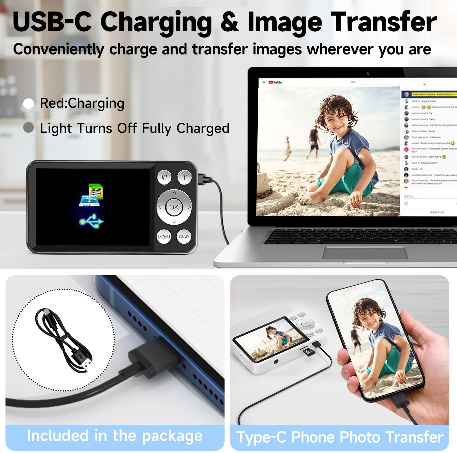 - 📷【2.8’’ Screen & 18x Digital Zoom】: The camera features a 2.8-inch large UHD display for easy viewing, and supports 18x digital zoom with a W/T button, which allows you to capture clear images even from a distance, providing a unique photography experience.