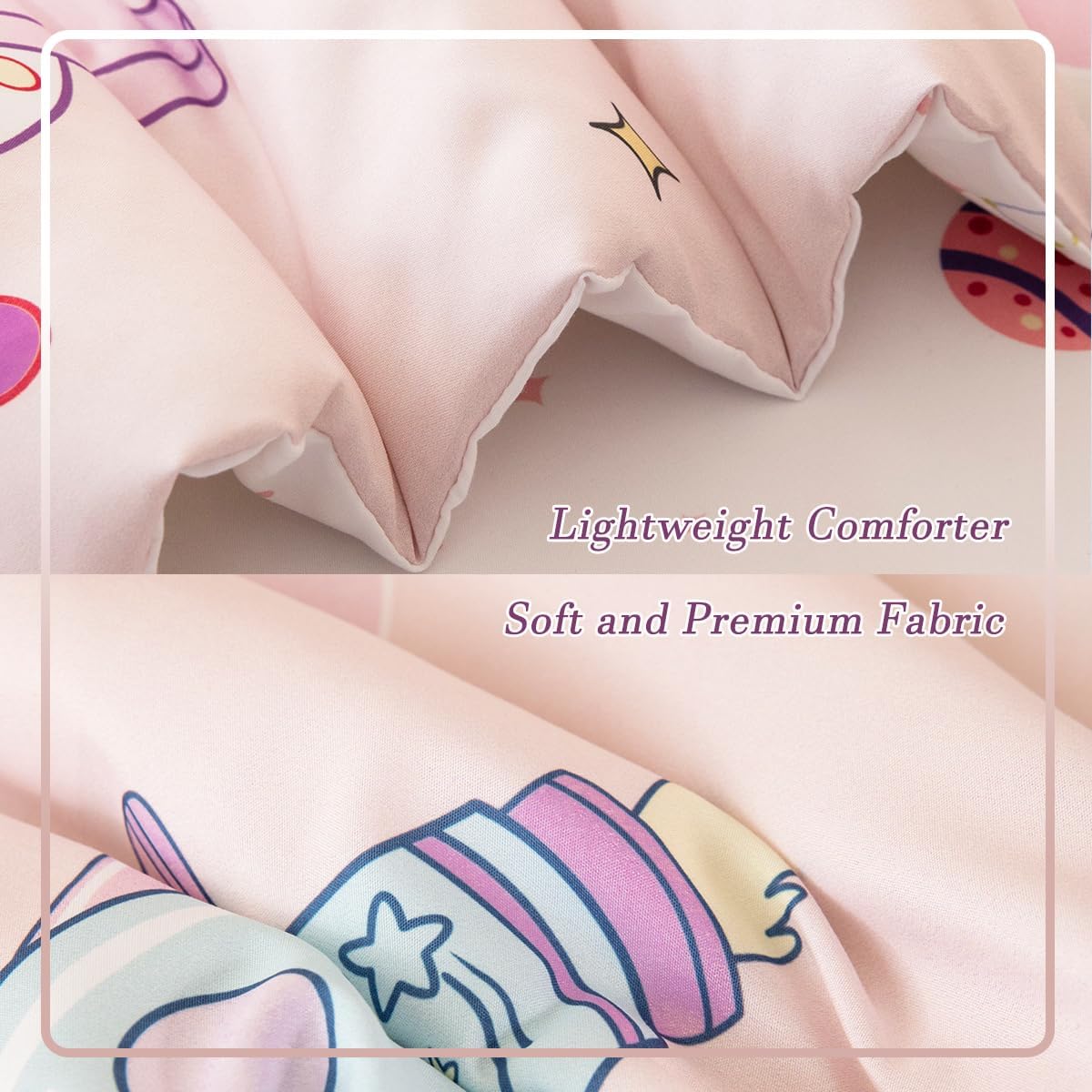 - 4-PIECE TODDLER BEDDING-This reversible pink space toddler bedding set includes 1 toddler comforter(57'' x 42''), 1 fitted sheet(52'' x 28''+7.9''), 1 flat sheet(60'' x 45''), and 1 pillowcase(30'' x 20''). Designed with 8'' depth, this toddler bedding is greatly suitable for toddler mattress or crib.
