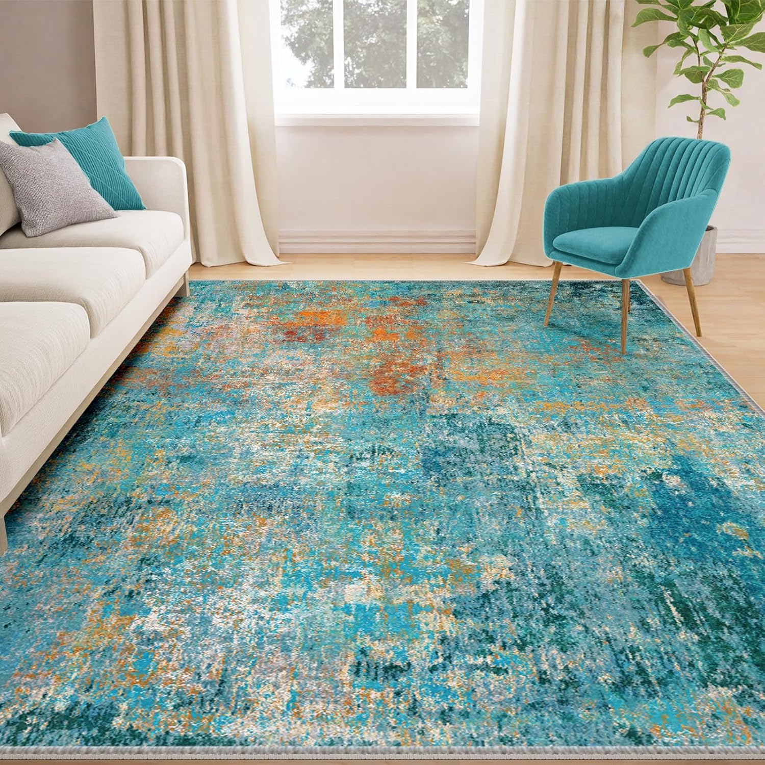 Washable Area Rugs 5'x7' Non-Slip Modern Abstract Soft for Living Room Entryway Bedroom Nursery, Print Pattern, Teal Blue Green Orange Rust Red Colorful