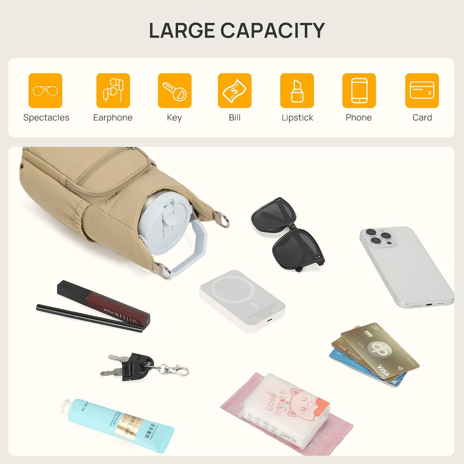 - Telena Water Bottle Bag: Made of high quality down fabric with adjustable vintage shoulder straps makes this water bottle holder classic yet stylish. The soft and waterproof down filled cotton material has better water and shock resistance while maintaining high softness and elasticity. Not only to prevent the water cup bump, but also wear light. Please note that this crossbody bag cannot be washed or machine washed