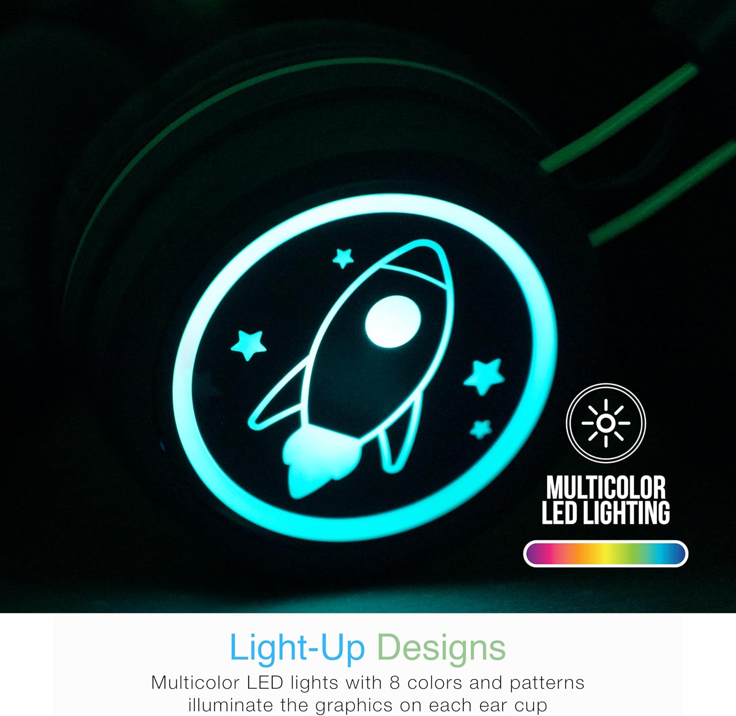 - LIGHT-UP DESIGNS & 4 AUDIO MODES: multicolor LED lights with 8 color patterns illuminate the graphics on each ear cup, giving each KidJamz headphone a vibrant and unique style; optional customization with a personalized name, graphic, or logo is also available; plus, 4 distinct audio modes let kids further personalize their listening experience at the touch of a button