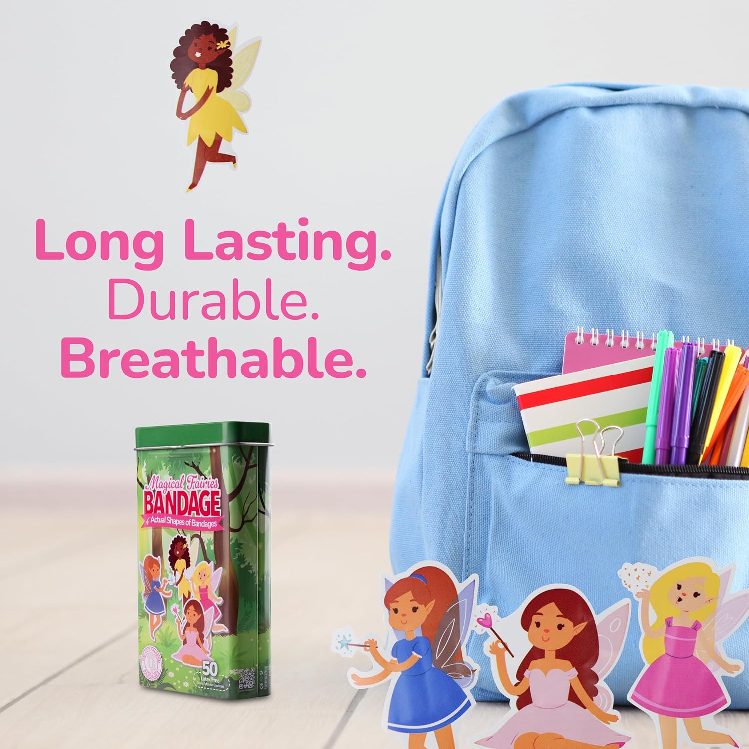 - MAGICAL FAIRY BANDAGES: This 50 piece tin of fairy shaped bandages features 4 fun magic fairy shapes, and is great for putting a smile on kids' faces while protecting wounds such as cuts, scrapes, and burns; sticky bandages come in a cute tin and are perfect for kids and adults alike, and also for school nurses and pediatric doctors