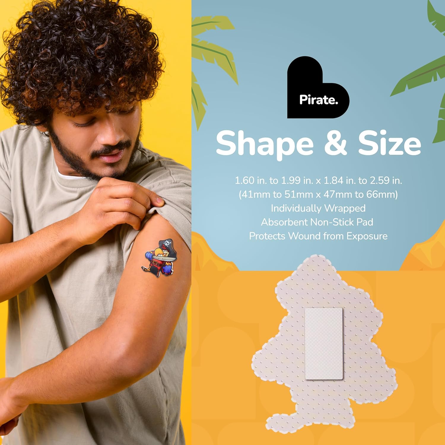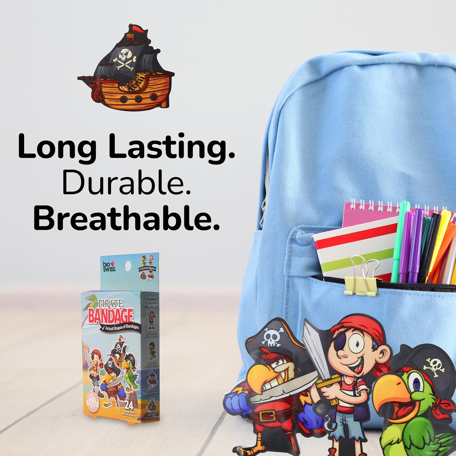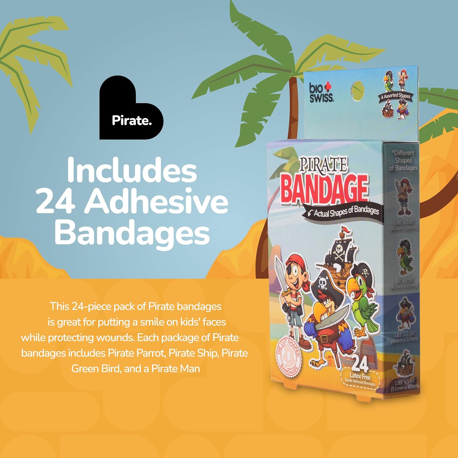- PIRATES BANDAGES: This 24 piece pack of pirate shaped bandages features 4 fun pirate, parrot, and pirate ship shapes, and is great for putting a smile on kids' faces while protecting wounds such as cuts, scrapes, and burns; sticky bandages come in a cute cardboard box and are perfect for kids and adults alike, and also for school nurses and pediatric doctors