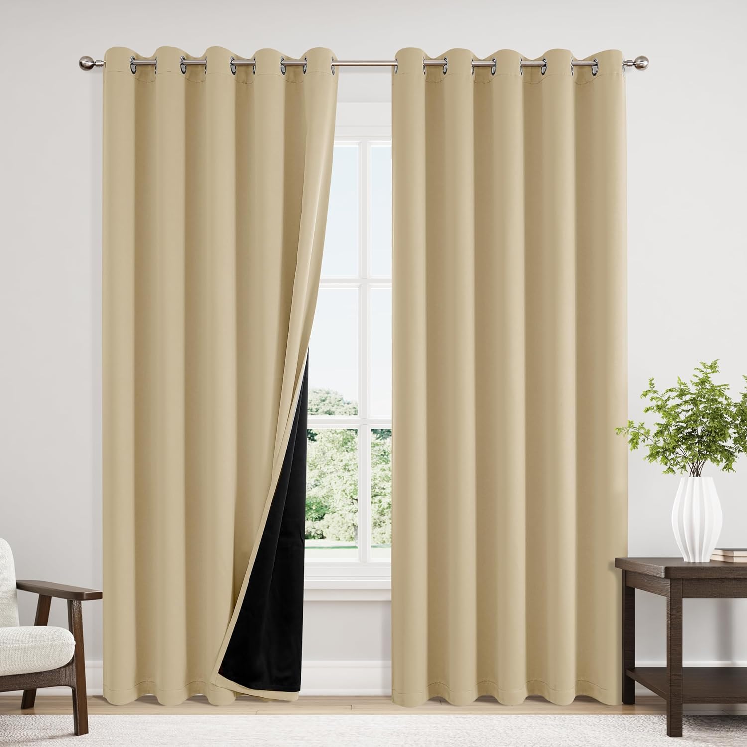 ChrisDowa 100% Blackout Curtains 84 inch Long for Bedroom with Black Liner, Extra Wide 2 Thick Layers Total Blackout Thermal Insulated Grommet Window Curtains 2 Panels Set (Beige, 60 x 84 Inch)