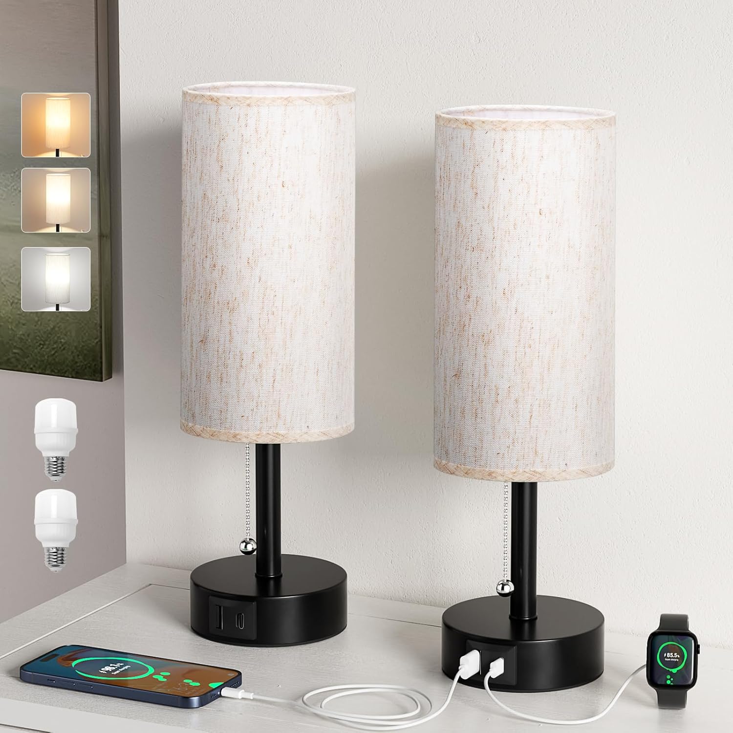 - Bedside Lamps Set with USB Ports - This modern bedroom lamp provides a convenient USB ports that eliminates the need for additional power outlets, simplifies desktop wiring, and keeps your desk tidy. The USB C and USB A is always available for connection to other devices, such as your cell phones, tablets, laptops, humidifiers, smart watch and more, regardless of whether the matching bed lamp is on or off. This compact night lamp is ideal for small office or study environments