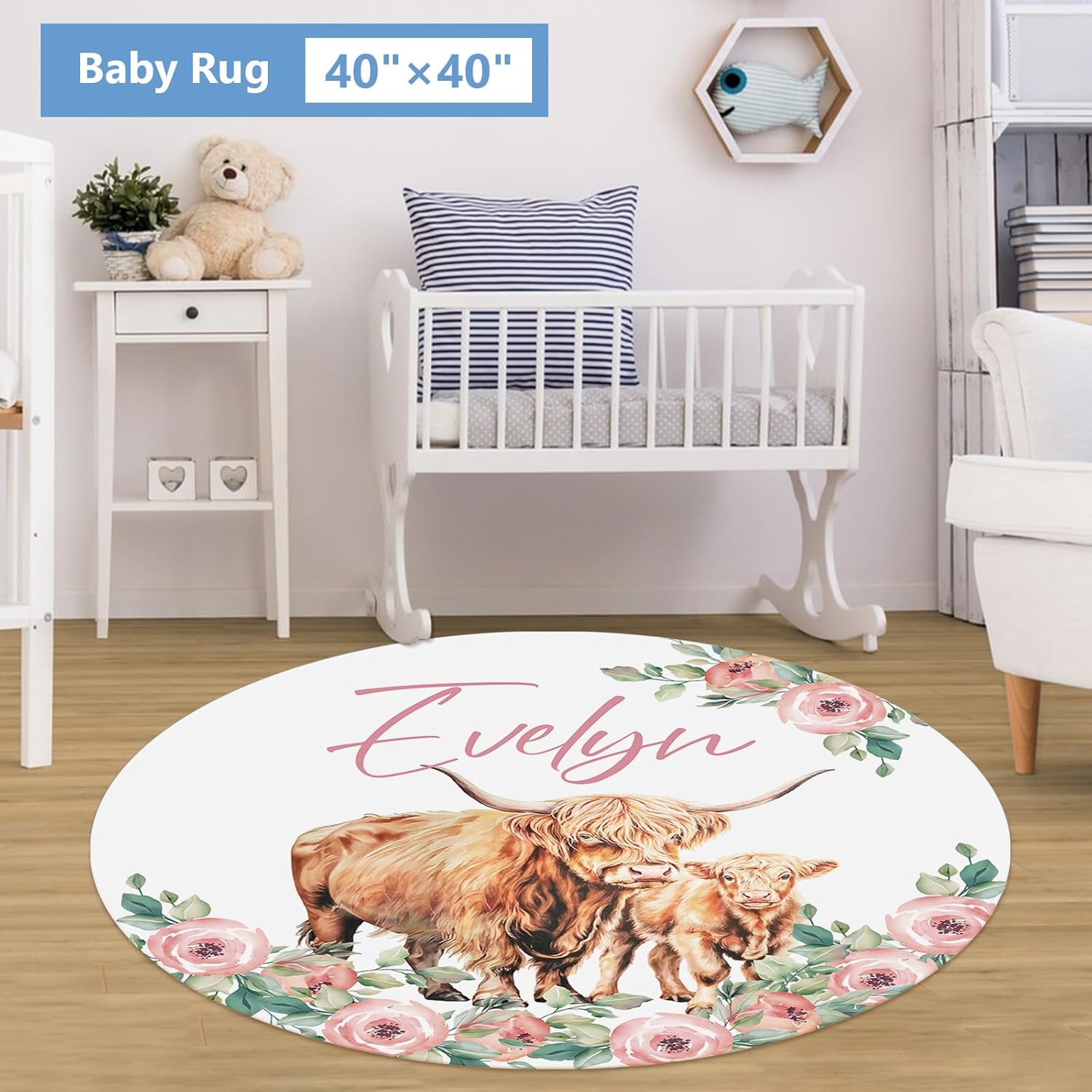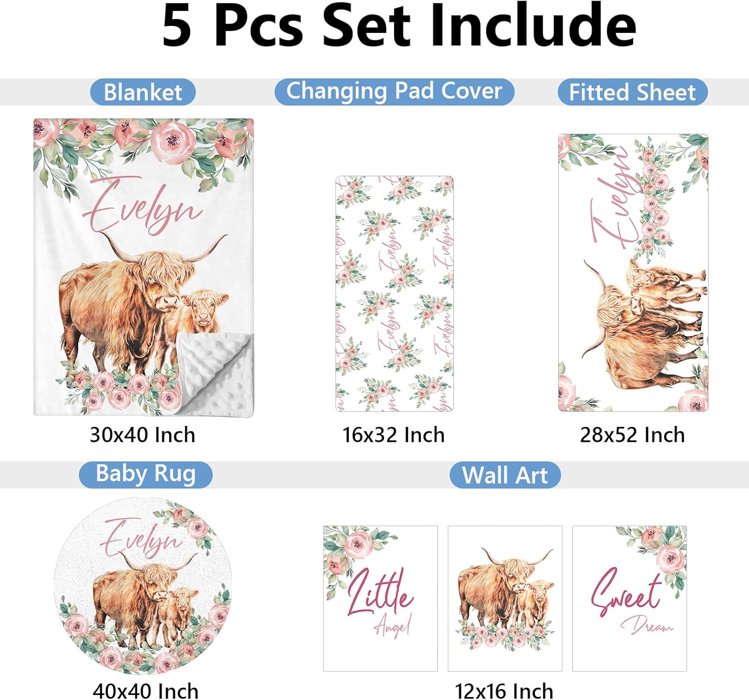 Personalized Nursery Bedding - 5 Pcs Custom Baby Crib Set with Name, Double Layer Crib Bedding for Girls, Cows and Flowers Theme