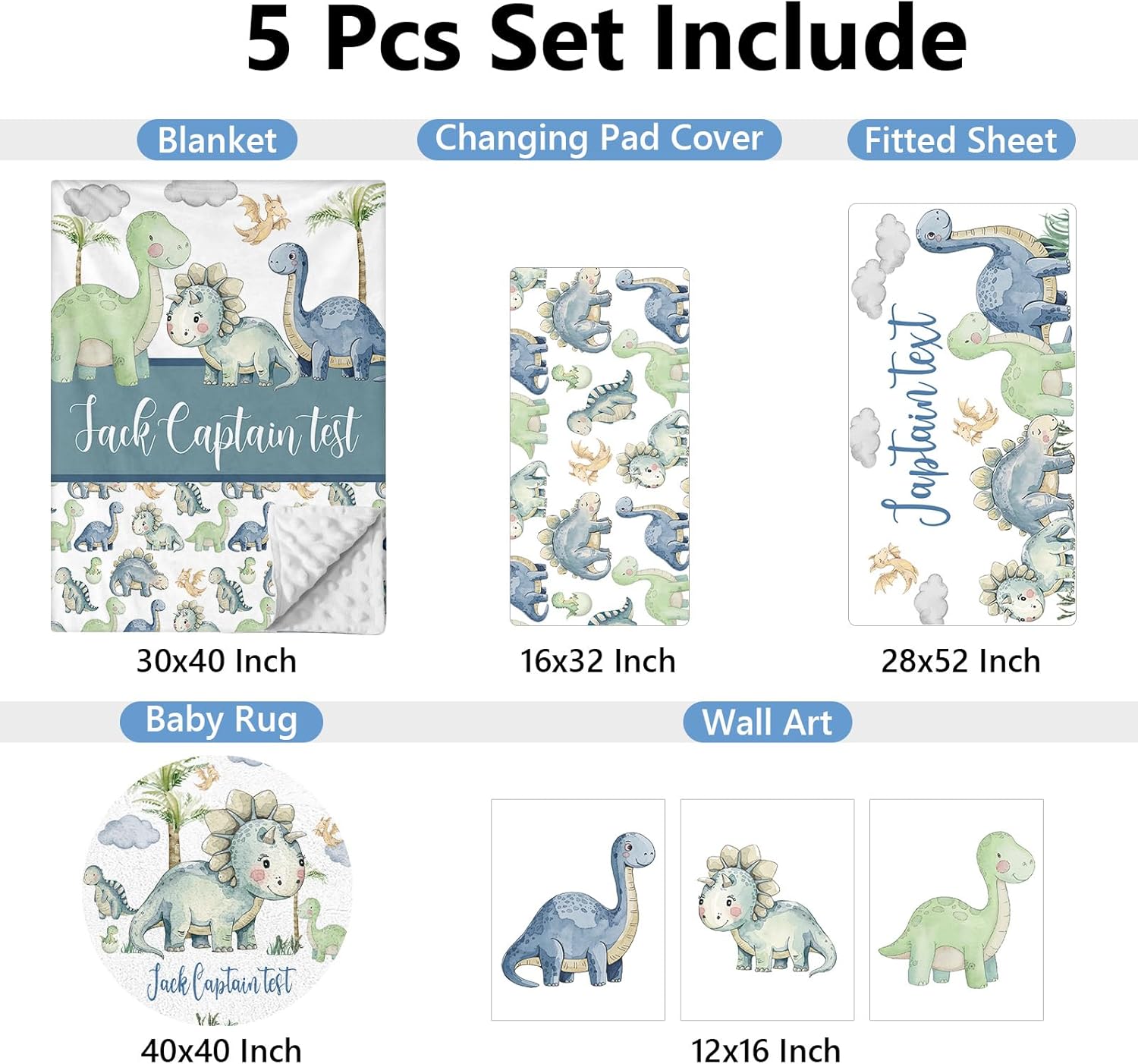 Custom Baby Crib Bedding Set, 5 Pcs Personalized Name Green Dino Baby Crib Set for Kid Infant Toddler, Double Layer Customized Present