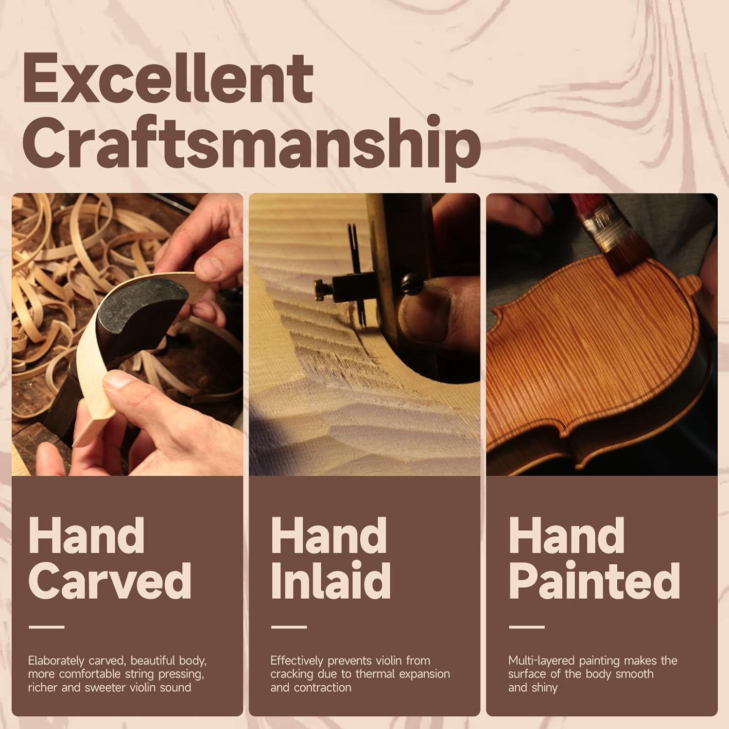 - Carefully Handcrafted: The YorRay violin is a true work of art, built using the traditional production process of the Italian Stradivarius model. Every detail, from the headstock and piano board to the F-hole and internal bracing, is handcrafted with precision. The technical error range is strictly controlled within 0.1mm, ensuring smooth lines, a comfortable feel, and stable, beautiful pronunciation. This dedication to craftsmanship guarantees a violin that is as visually stunning as it is sonically superior.