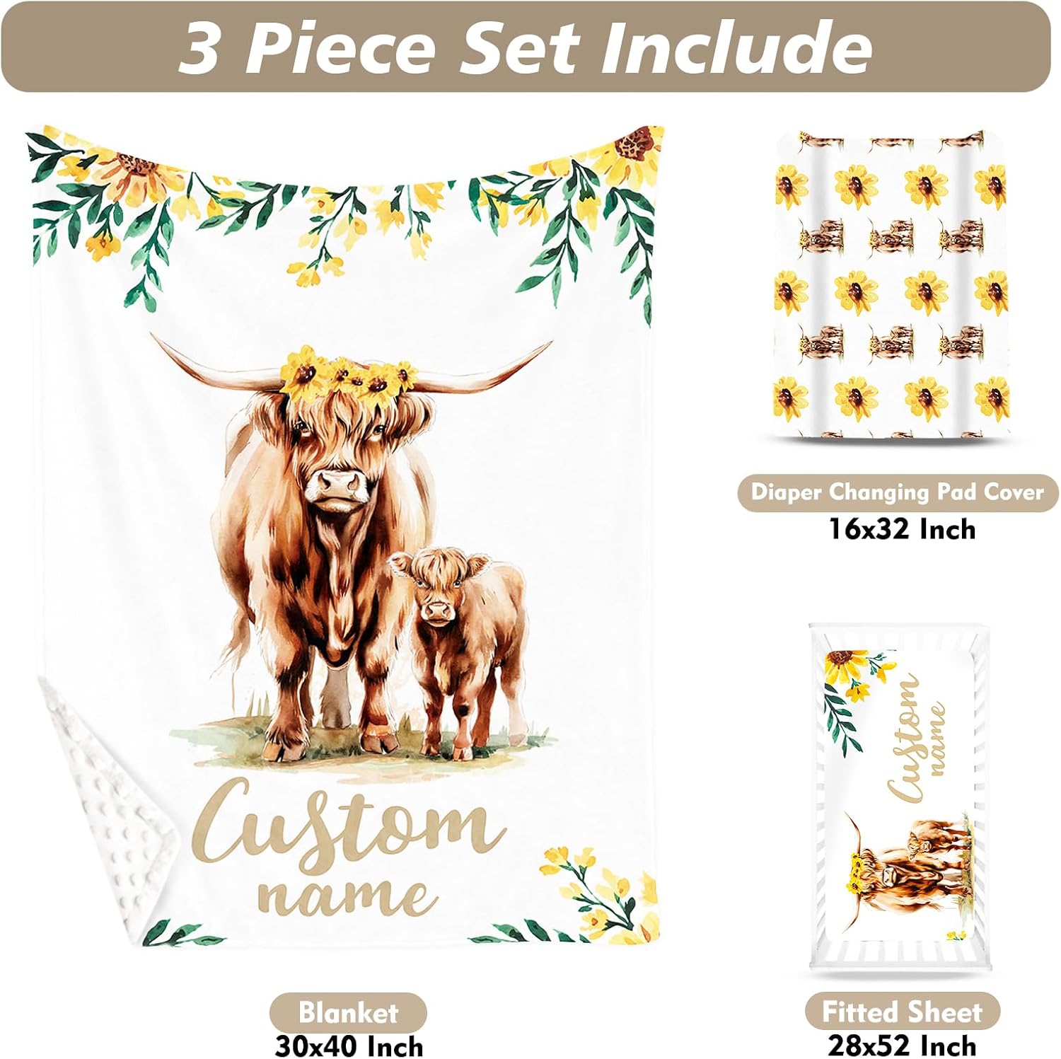 Custom Name Crib Bedding Set - Highland Cow Theme, Personalized Yellow Floral Nursery Bedding 3-Piece Set– Soft Blanket, Fitted Sheet, Changing Pad Cover – for Newborns Girls Nursery Gifts
