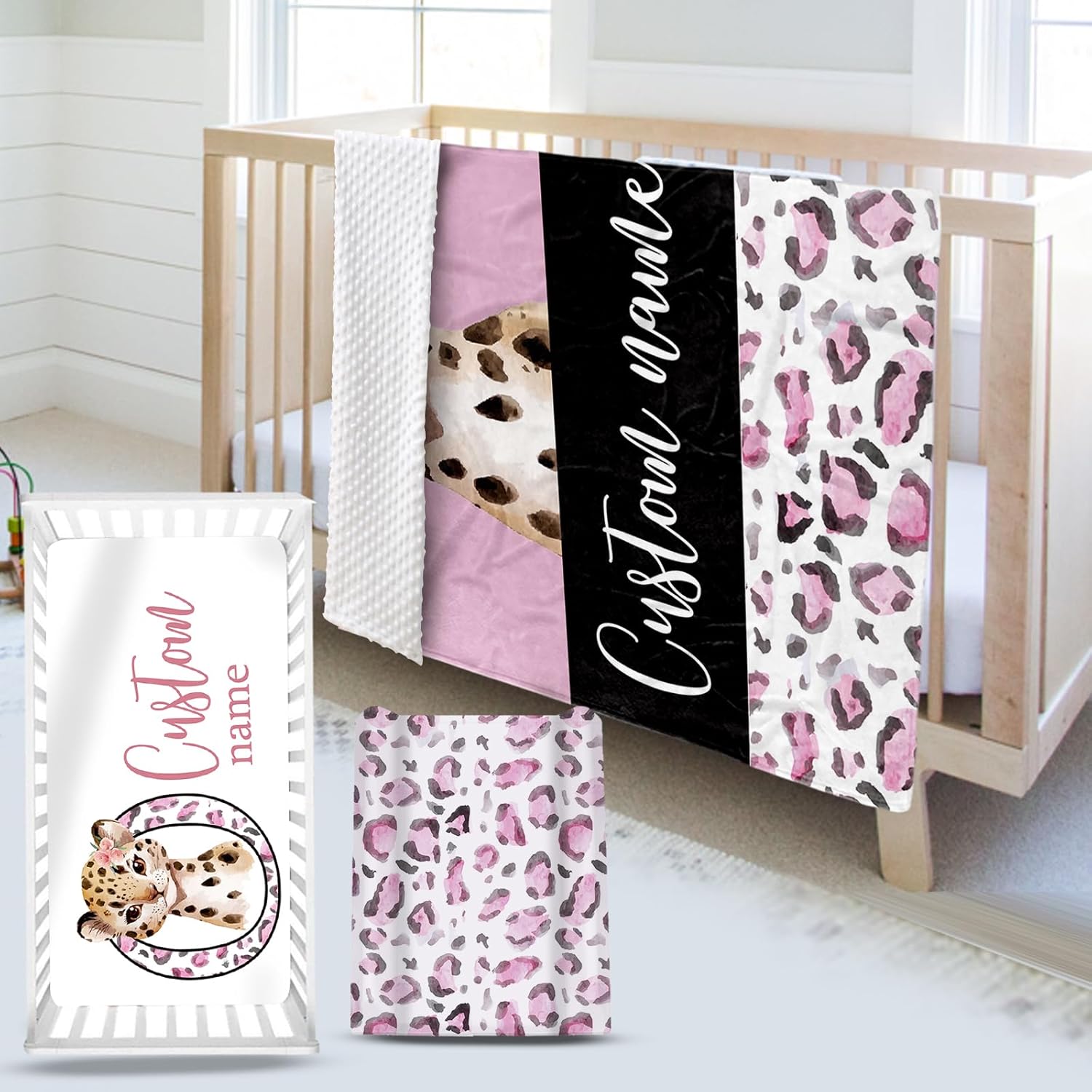 Custom Name Crib Bedding Set - Pink Leopard Theme, Personalized Nursery Bedding 3-Piece Set– Soft Blanket, Fitted Sheet, Changing Pad Cover – for Newborns Girls Nursery Gifts