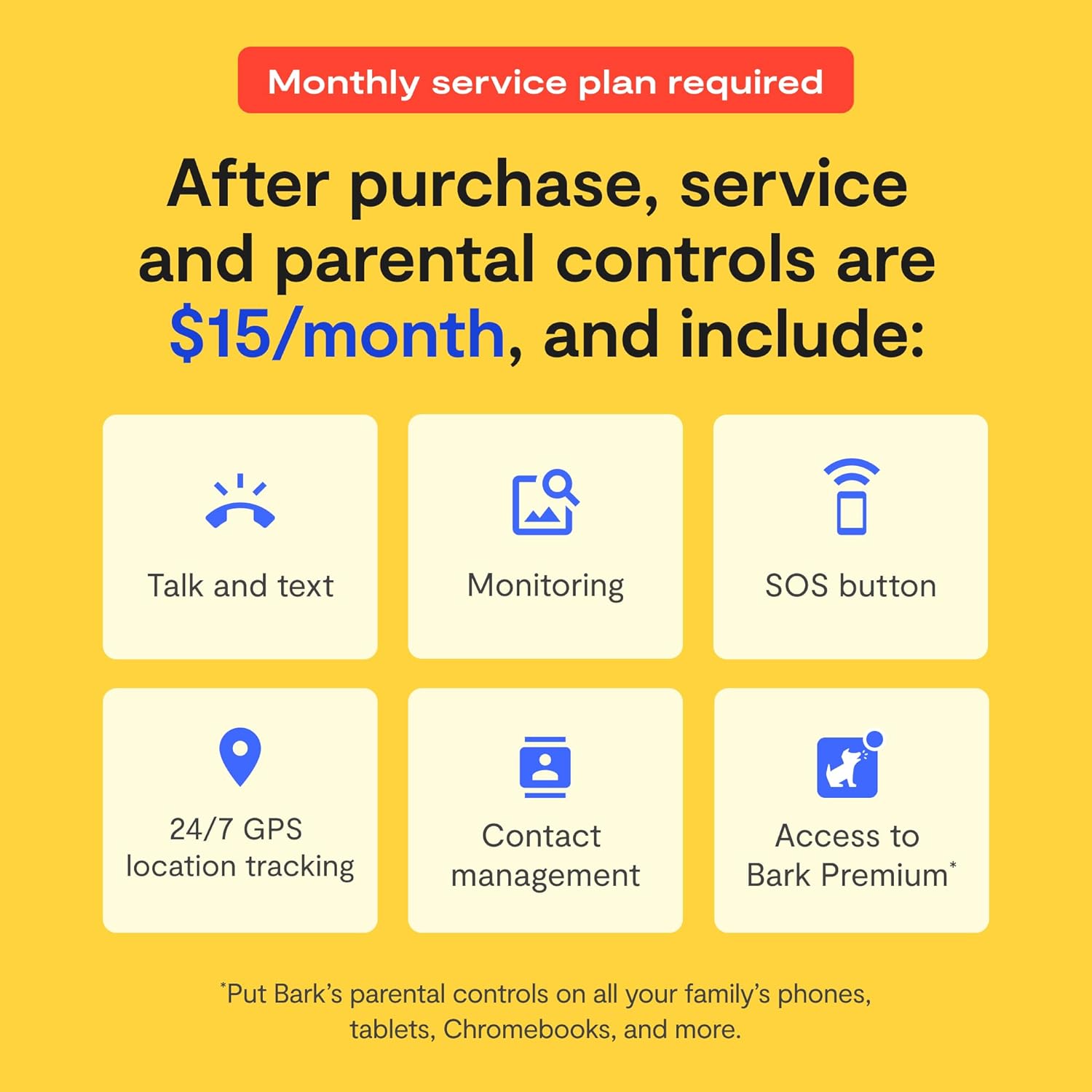 - ACTIVATION REQUIRED: After purchase, users will pay $15/month for service and parental controls. The Bark Watch has its own phone number.