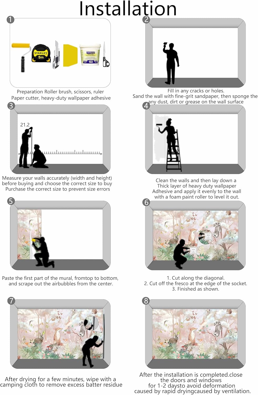- Installation Steps1. Fill in any cracks or holes and clean the surface of the wall of dust, dirt and grease.2. Apply heavy-duty wallpaper paste to the wall, not the mural.3. Mark the position of each strip of wallpaper with a spirit level.4. Align the pattern and slide it into place.5. Scrape the bubbles with a spatula.6. Let it dry for a couple of minutes and it's ready to go!