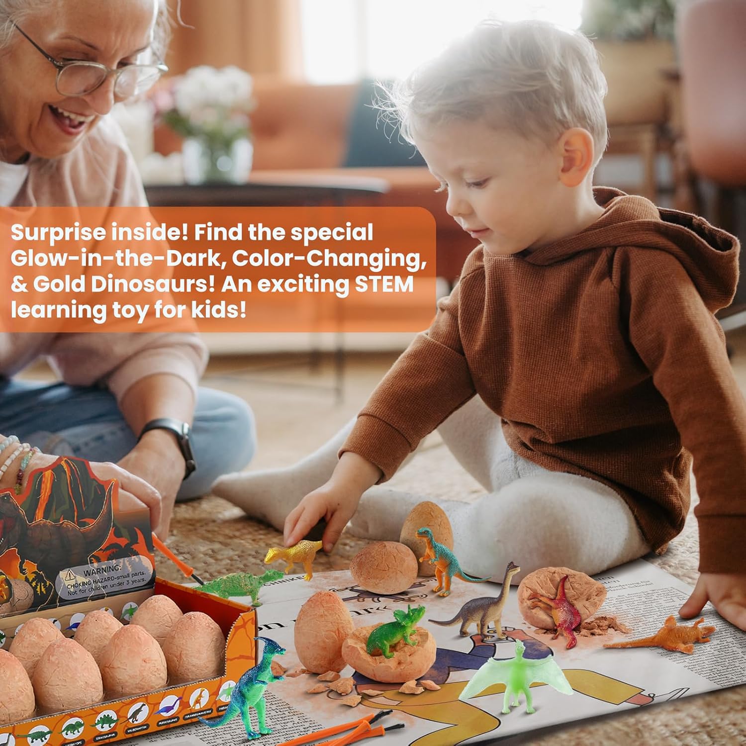 - 1.Uncover 12 Unique Dinosaur Models: Imagine being a real paleontologist! Excavate 12 dino eggs to discover unique toy dinosaurs, including 3 Special Surprise Dinosaurs, one Glow-in-the-Dark Dinosaur, one Color-Changing Dinosaur and one Golden Dinosaur.