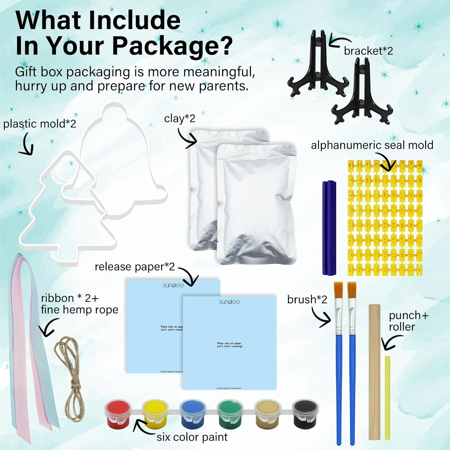 - The Most Complete Kit:Everything you need to make beautiful, lasting handprints, footprints or paw prints souvenir ornaments to display on your mantel or hang on your Christmas tree. Includes air-dried clay, roller, straw, 2 paintbrushes, 2 ribbons, bonus custom template kit, 2 display stands, 6 colors of paint, simple instruction manual.
