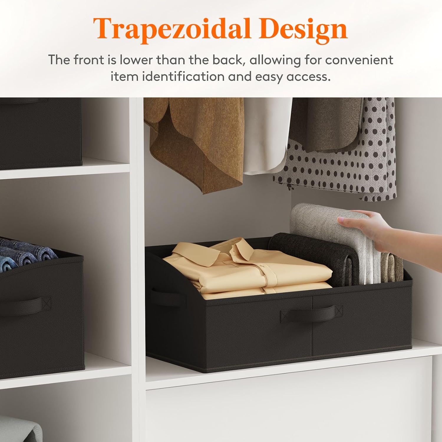 - Open Trapezoid Design: These storage baskets for shelves feature a trapezoidal design with the front lower than the back, providing an unobstructed view and making it easier to see and access items within the basket. This trapezoidal design enhances usability and accessibility, ensuring a clutter-free and organized storage solution.