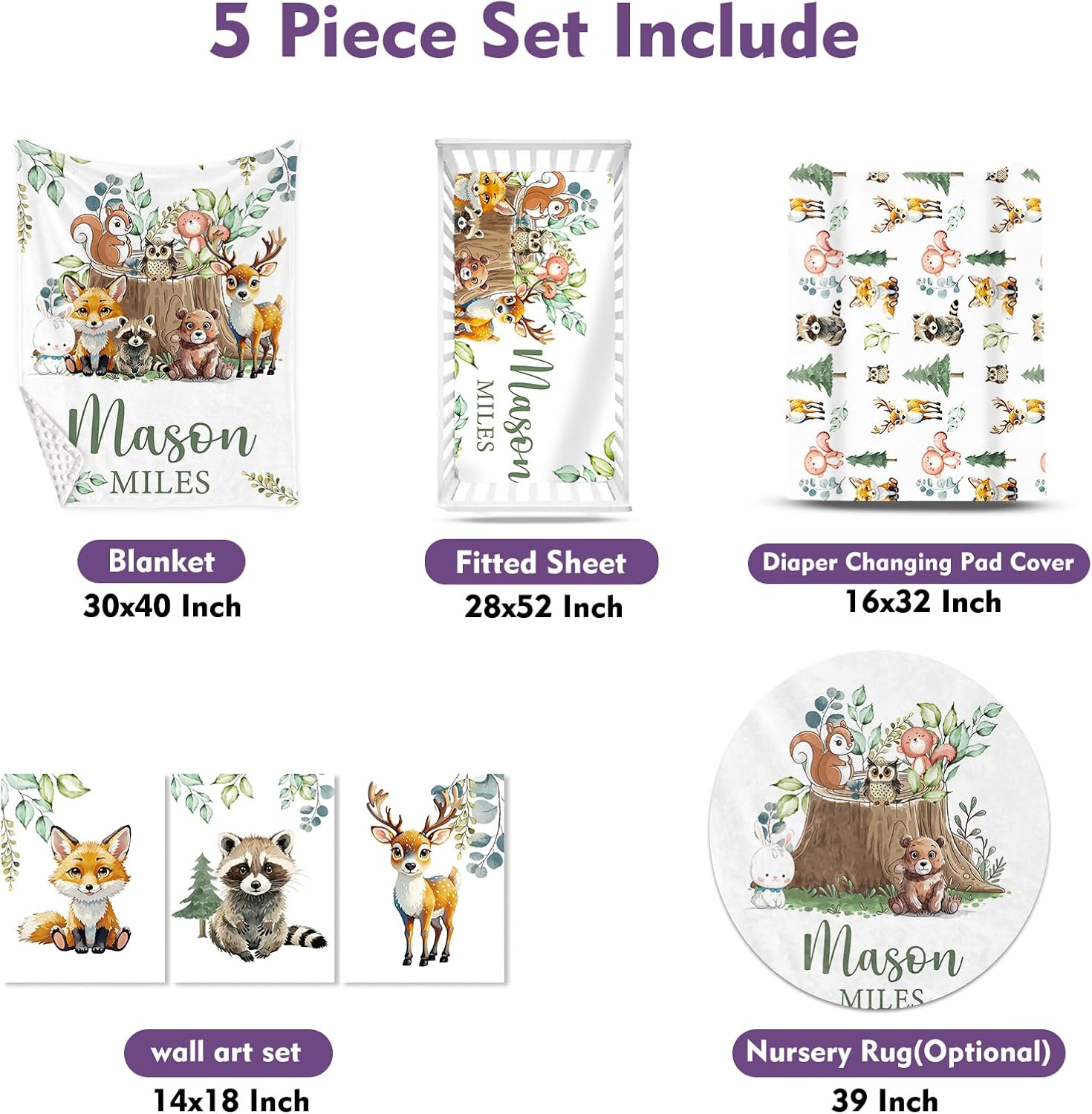 - Included Components : Changing Pad Cover, Double Layer Blanket, Fitted Sheet, Round Rug, Wall Art