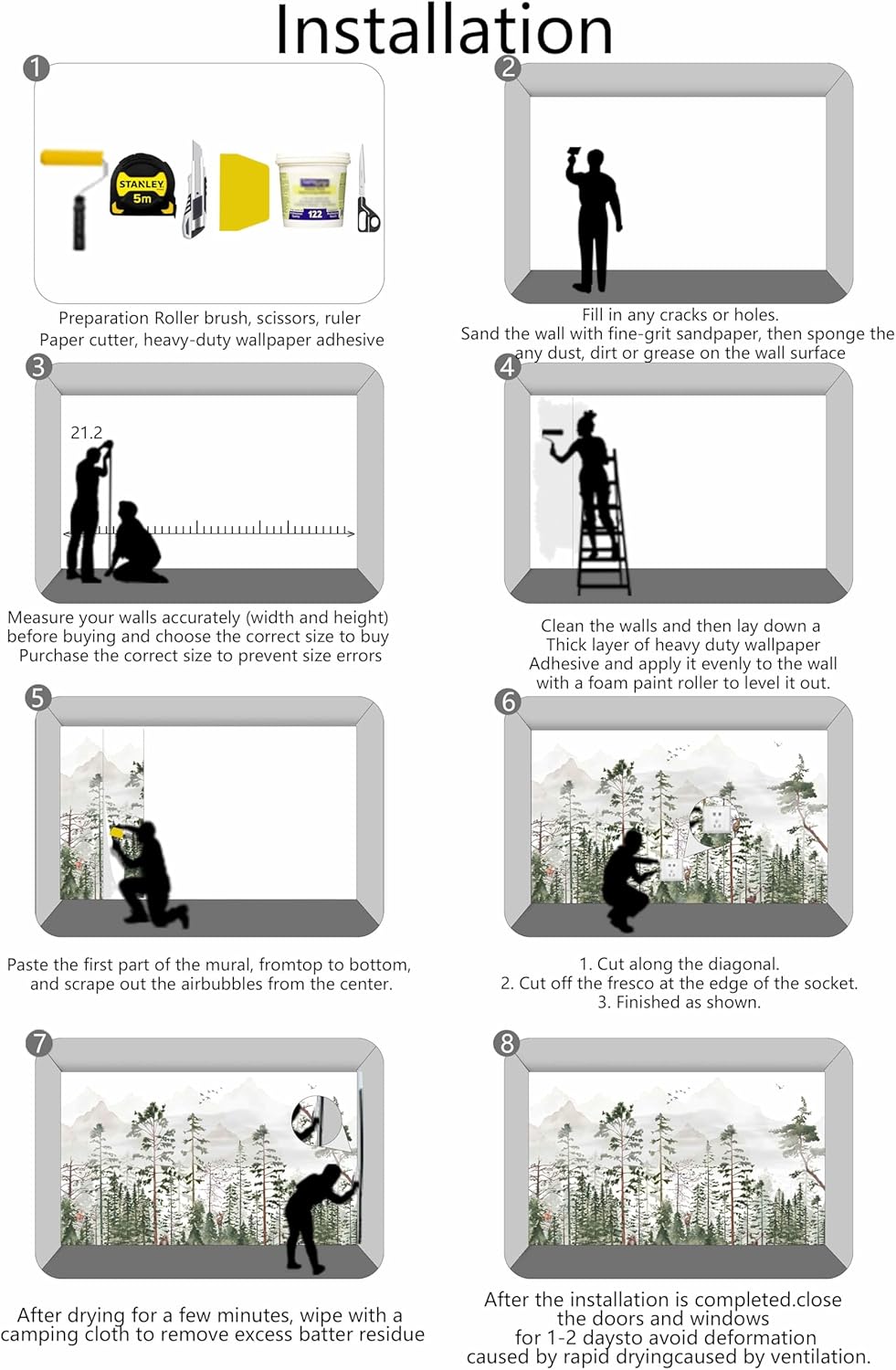 - Installation Steps1. Fill in any cracks or holes and clean the surface of the wall of dust, dirt and grease.2. Apply heavy-duty wallpaper paste to the wall, not the mural.3. Mark the position of each strip of wallpaper with a spirit level.4. Align the pattern and slide it into place.5. Scrape the bubbles with a spatula.6. Let it dry for a couple of minutes and it's ready to go!