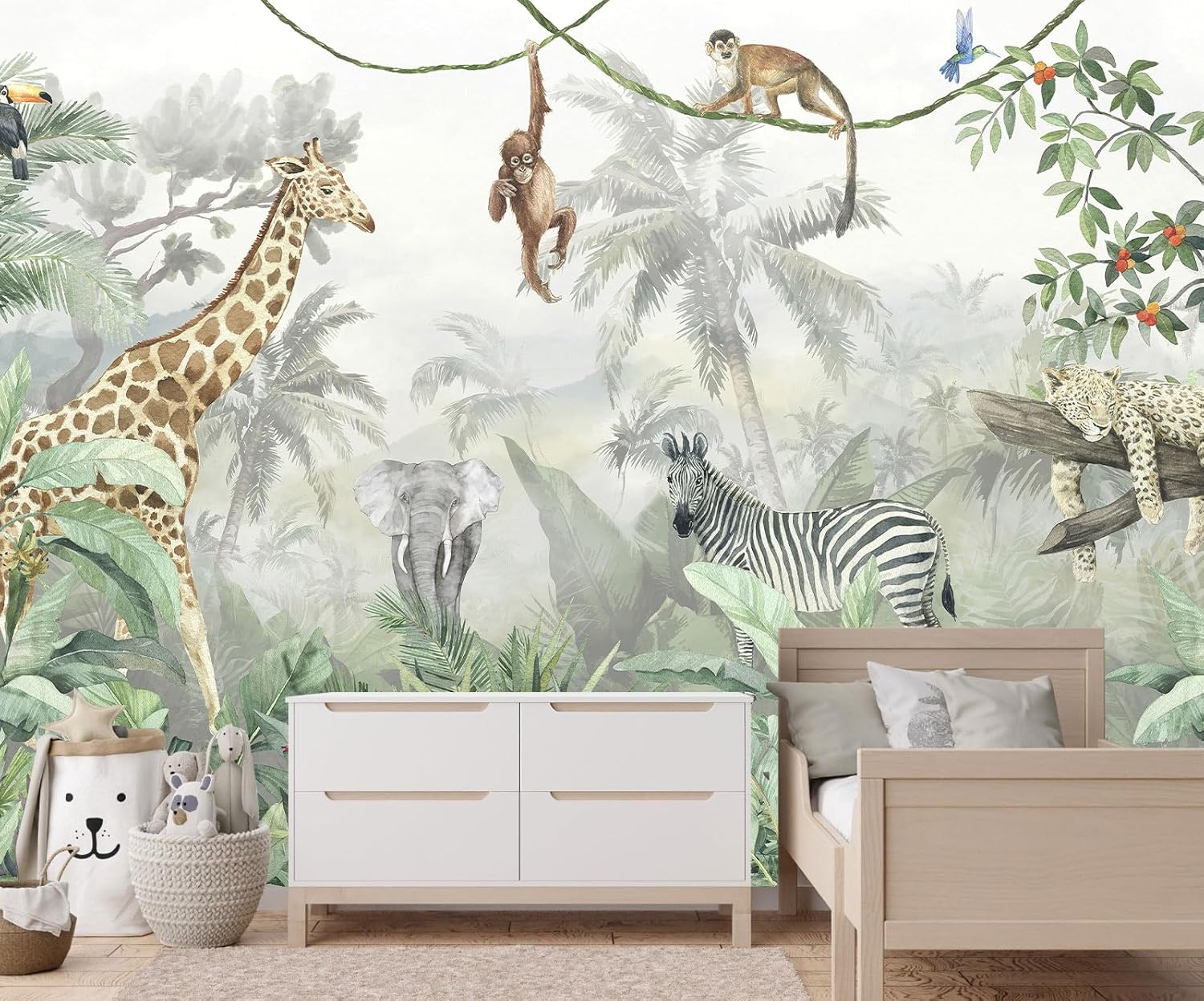Nursery Safari Wallpaper Kids Tropical Jungle Banana Leaf Wall Mural Animals Wall Decor for Boys Room Girls Room Bedroom Living Room(Not Self-Adhesive)