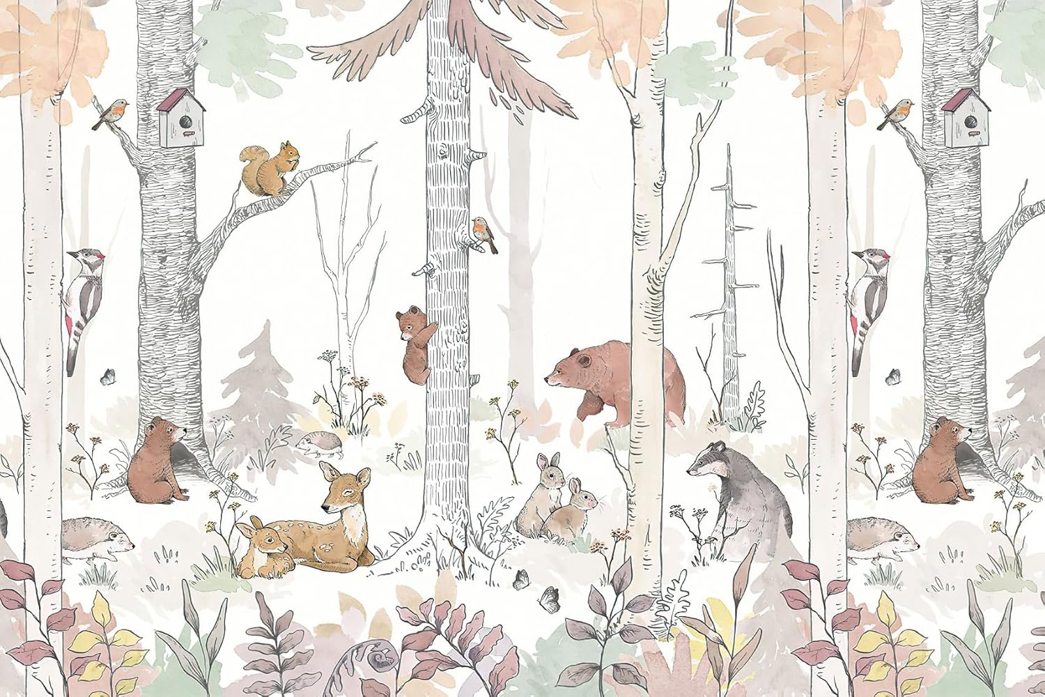 Watercolor Birch Tree Forest Wallpaper Woodland Animal Wall Mural for Kids Bedroom Nursery Room Living Room(Not Self-Adhesive)