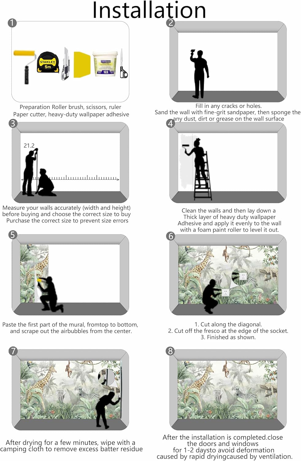 - Installation Steps1. Fill in any cracks or holes and clean the surface of the wall of dust, dirt and grease.2. Apply heavy-duty wallpaper paste to the wall, not the mural.3. Mark the position of each strip of wallpaper with a spirit level.4. Align the pattern and slide it into place.5. Scrape the bubbles with a spatula.6. Let it dry for a couple of minutes and it's ready to go!