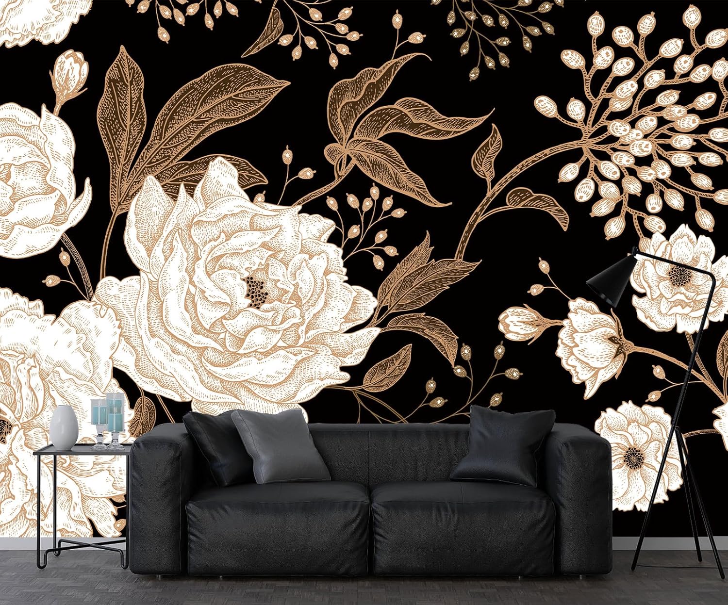 Vintage White Rose Floral Wallpaper Peony Wall Mural Large Black Background Wall Decor for Living Room Bedroom Dining Room Basement(Not Self-Adhesive)