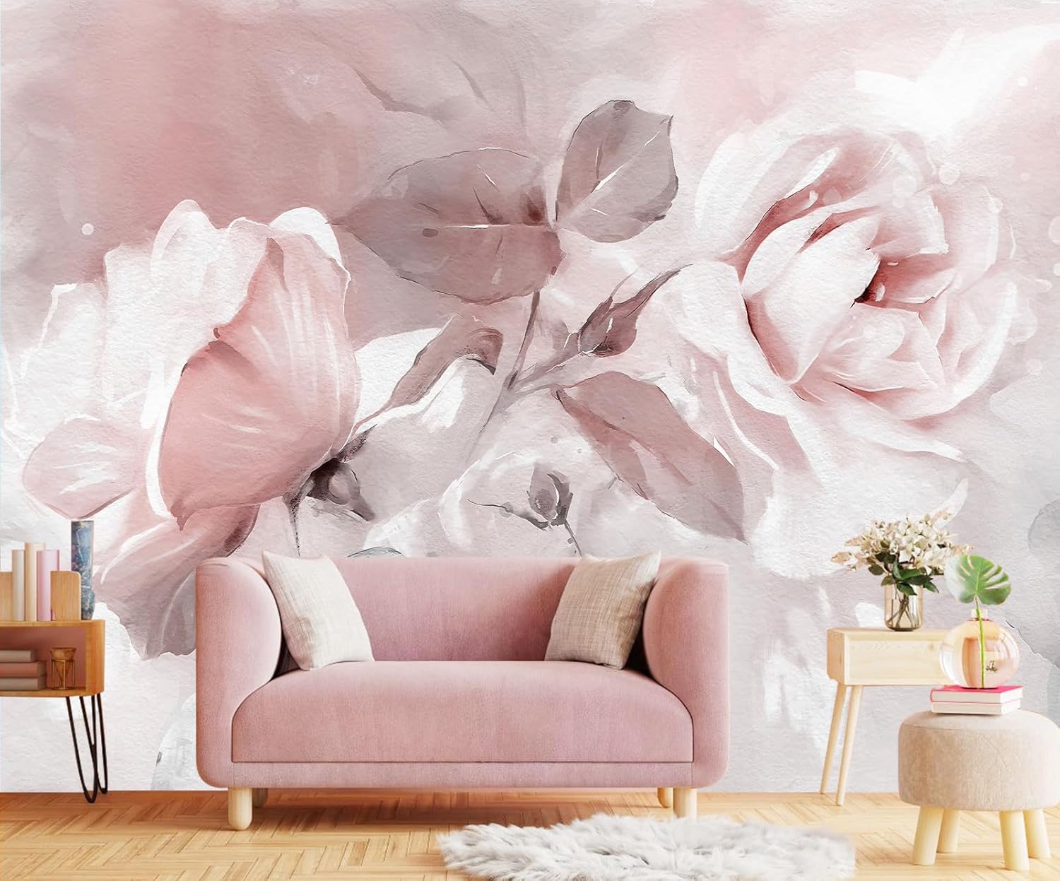 Pink Watercolor Peony Floral Mural Wallpaper Rose Flower Wall Mural for Living Room Bedroom Dining Room Office(Not Self-Adhesive)