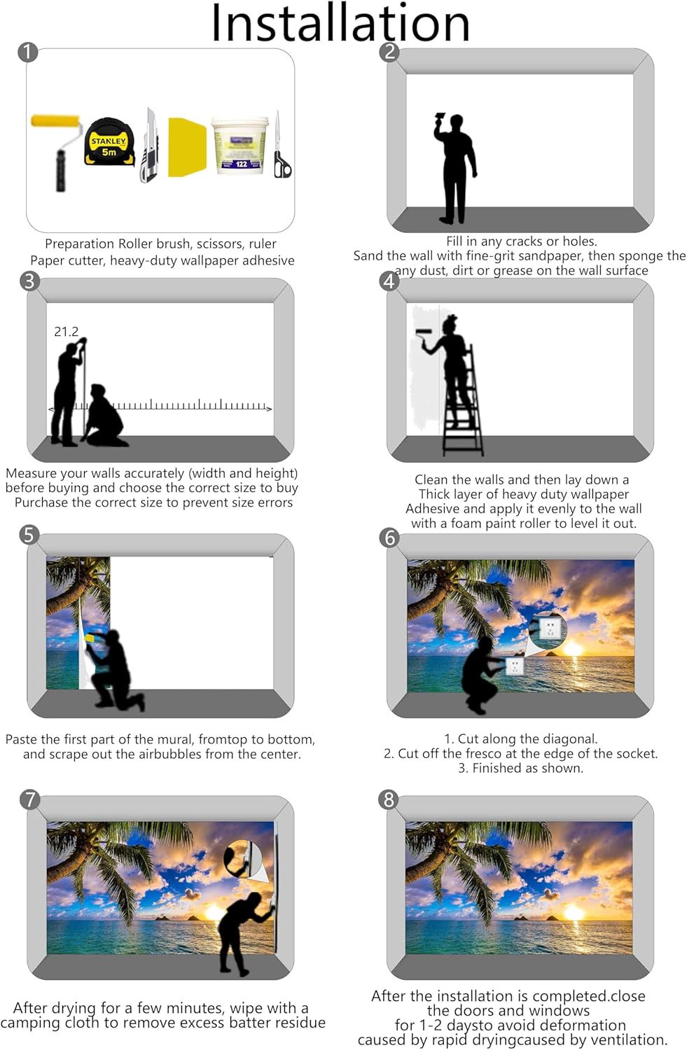 - Installation Steps1. Fill in any cracks or holes and clean the surface of the wall of dust, dirt and grease.2. Apply heavy-duty wallpaper paste to the wall, not the mural.3. Mark the position of each strip of wallpaper with a spirit level.4. Align the pattern and slide it into place.5. Scrape the bubbles with a spatula.6. Let it dry for a couple of minutes and it's ready to go!