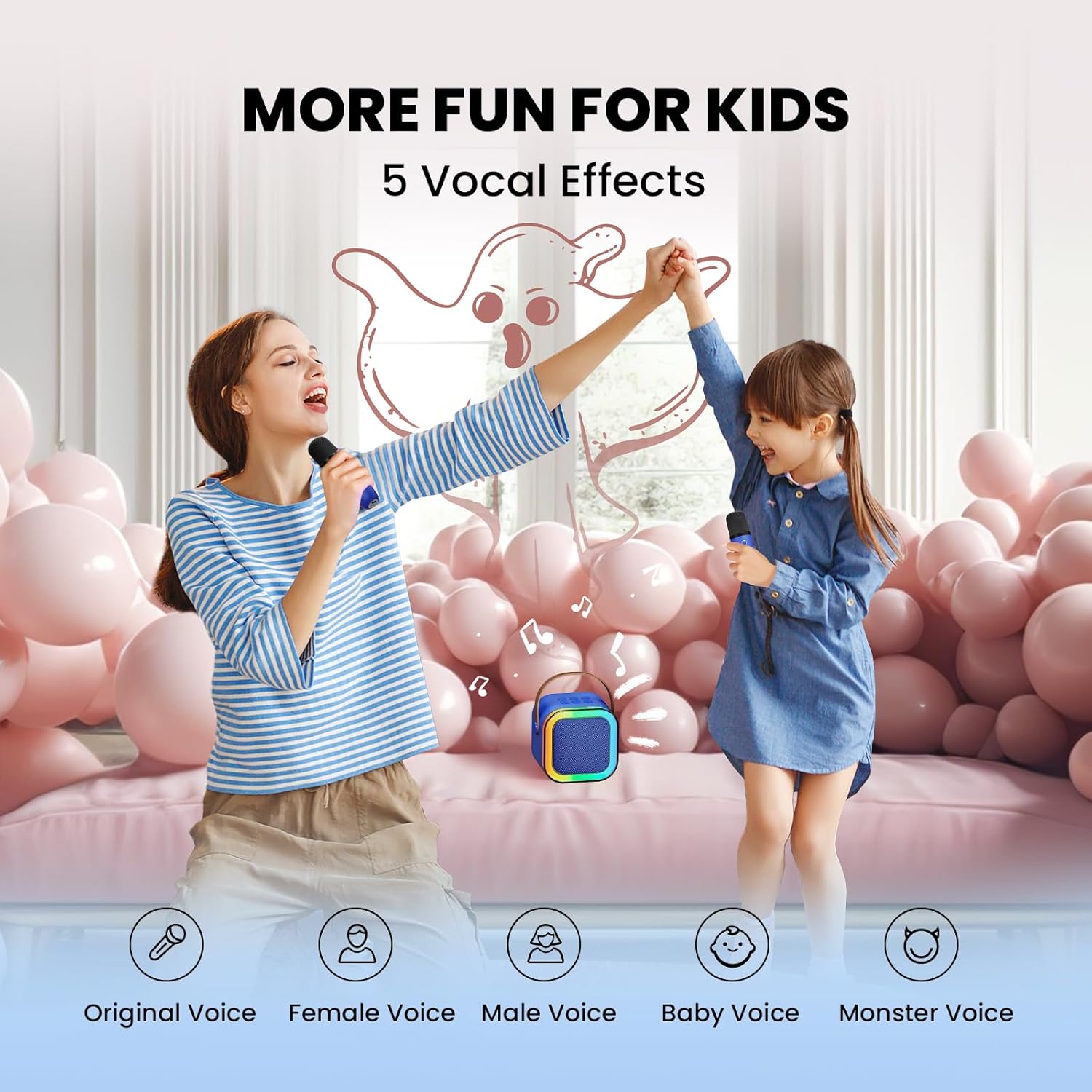 - Crystal Clear Sound & Endless Fun: As the pioneer in kids' karaoke machines, IROO features advanced audio drivers and digital signal processing for smart noise reduction—no Howling! With scientifically controlled volume to protect little ears. Plus, 5 fun voice effects add extra excitement to singing practice, kids can sing for hours without fatigue! Transform your living room into a concert hall and your backyard into a stage! Let the show begin!.