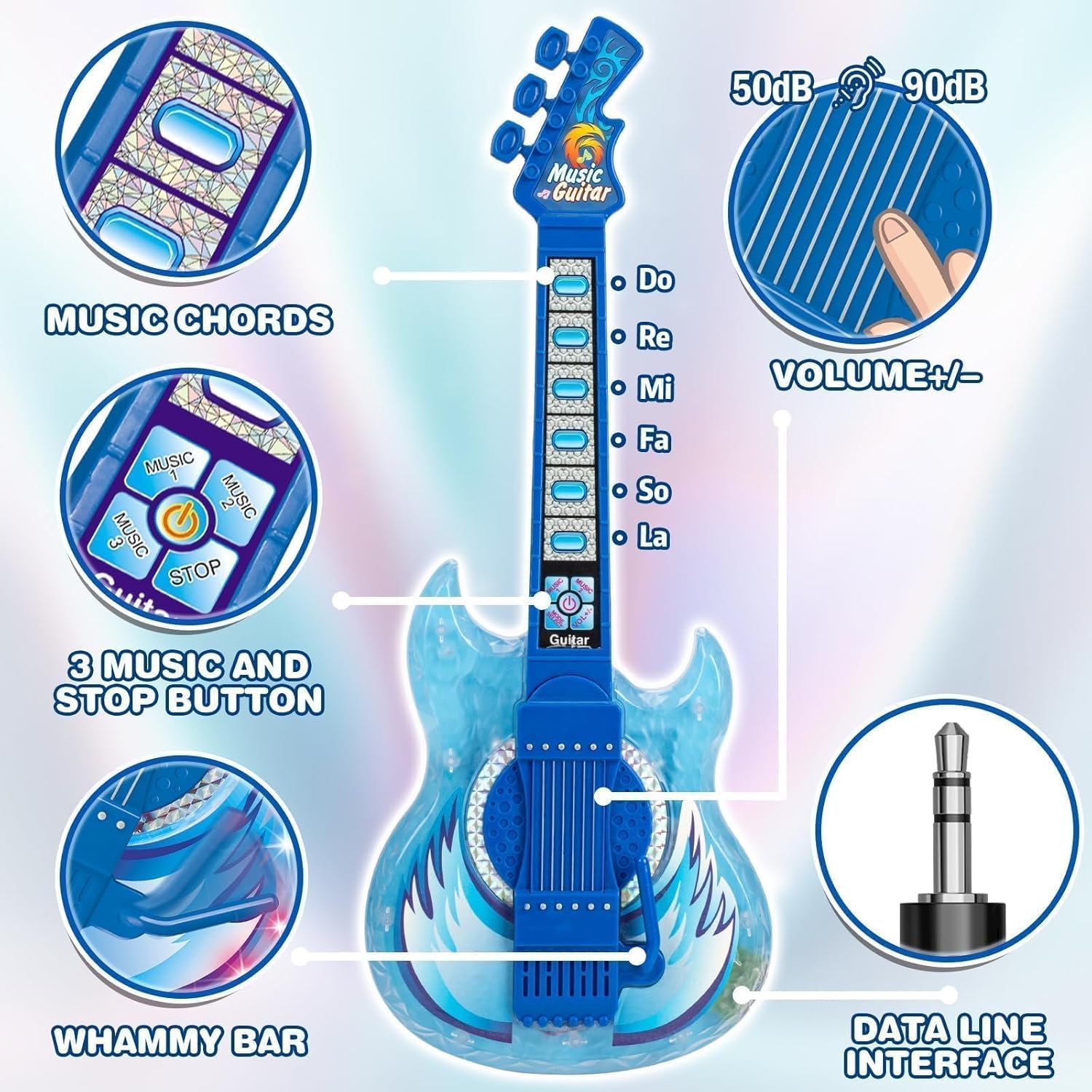 Kids Guitar and Microphone Set, Toy Guitar with Adjustable Volume and Strap, Microphone with Stand and Color Light, Toddler Musical Instrument for 3-5 5-9, Kids Karaoke Machine for Boy Girls(Blue)
