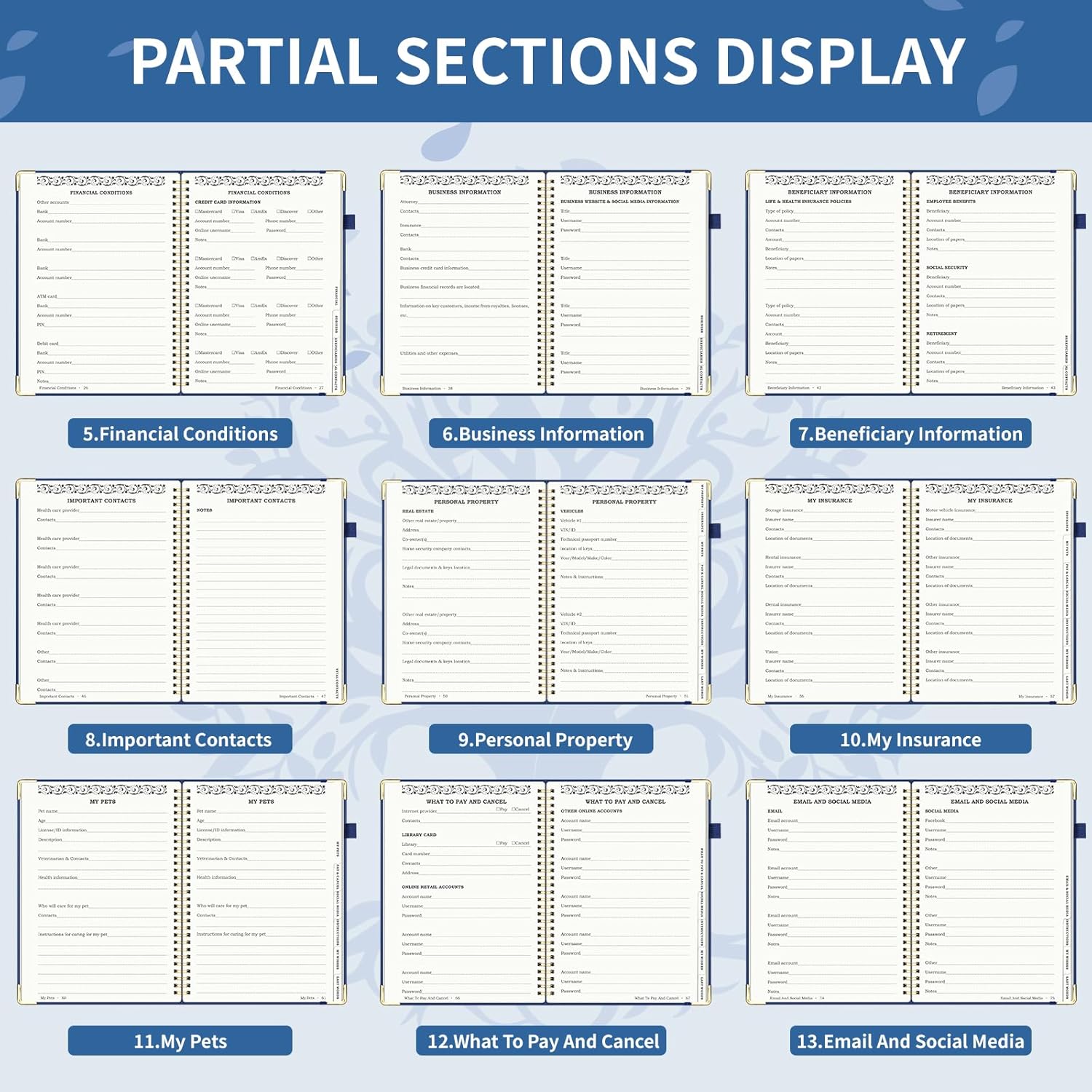 - Comprehensive Structure: The death book planner includes 16 detailed sections such as catalog pages, personal and family info, medical info, property and financial assets, beneficiaries, pet info, insurance coverage, active accounts, memberships, funeral arrangements, and final wishes.