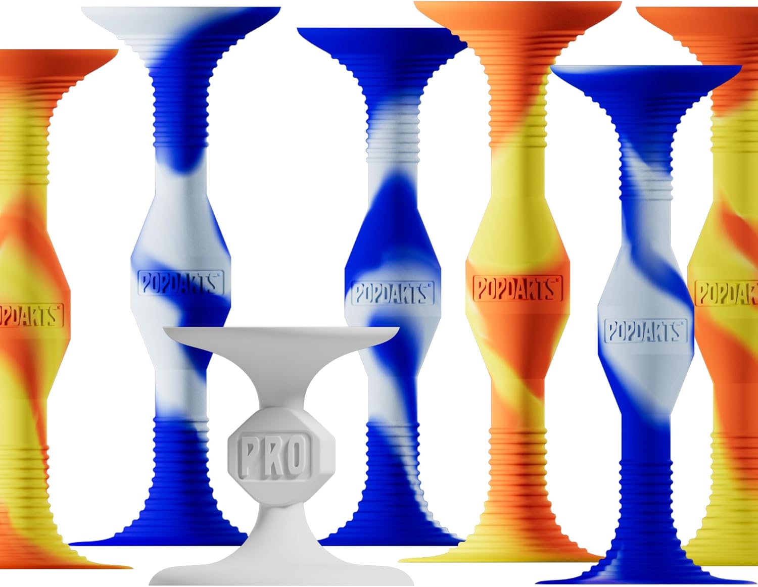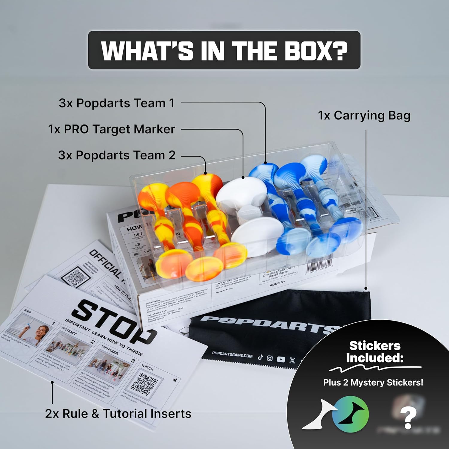 - WHAT’S INCLUDED IN A SET? 3 Orange/Yellow Swirled Popdarts | 3 Blue/White Swirled Popdarts | 1 White Target Marker | 4 Mesh Carrying Bag with rules printed right on the bag