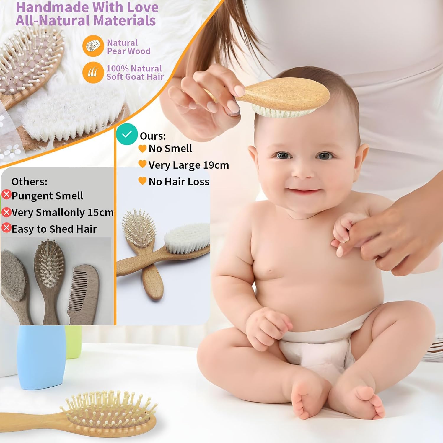 - PRACTICAL AND CUTE-THAT ANYONE WOULD LOVE AND USE : Sometimes gift boxes will include a few things that nobody really wants but this set has practical and cute things that anyone would love and use. Our baby brush and comb set is specifically made for delicate skin and help untangle baby hair. The toddler brush in our baby grooming kit are made with the finest Pear Wood, while the brush bristles are made with prime, organic Goat Hair that is famous for its luxurious softness